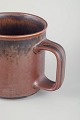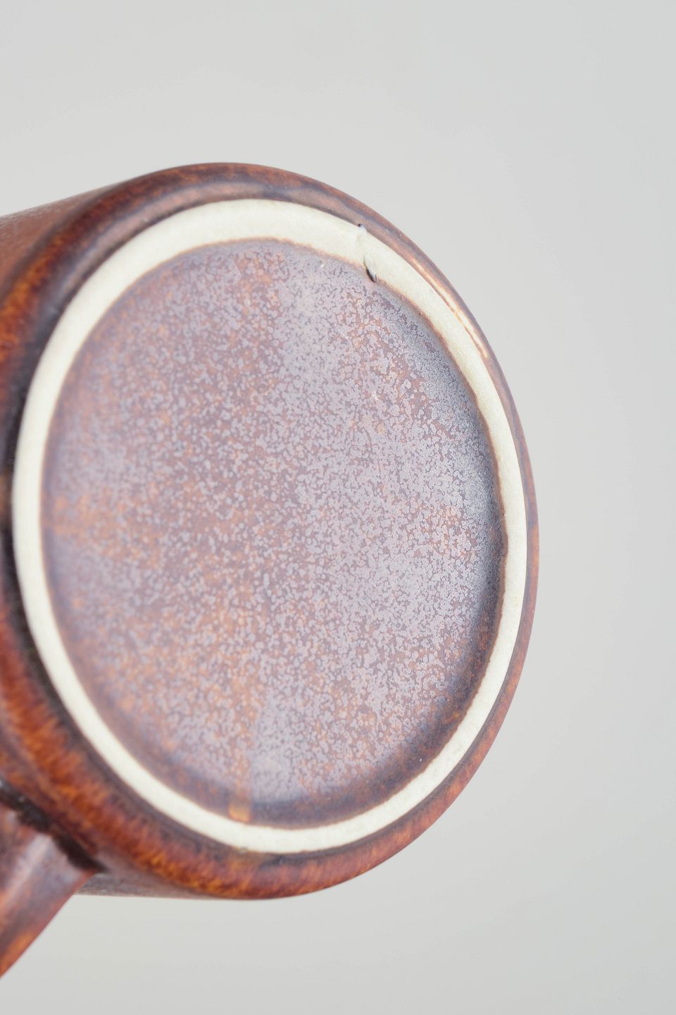 Cylindrical form with integrated handle and pouring spout, featuring a warm brown/russet glaze with rich tonal variation and dark, flowing rim.