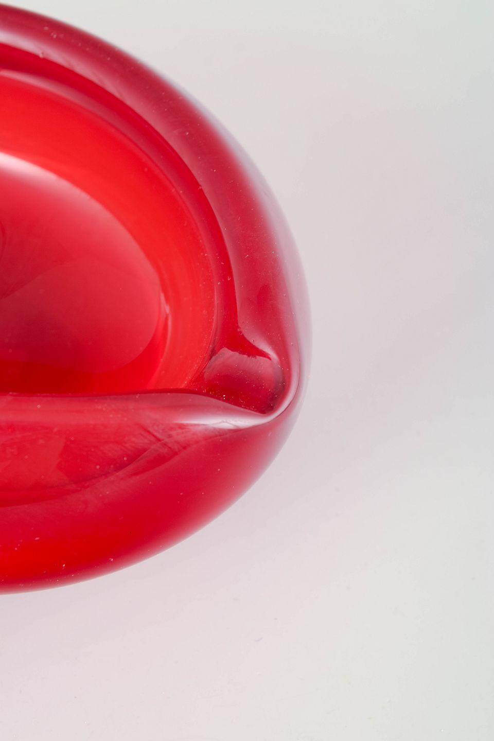 Organic freeform hand-blown bowl in deep ruby red sommerso glass with softly folded rim and luminous inner depth — a classic example of Murano studio glass.