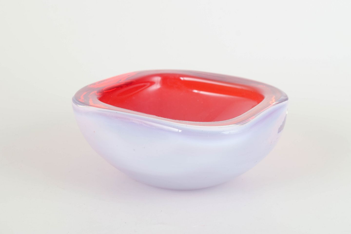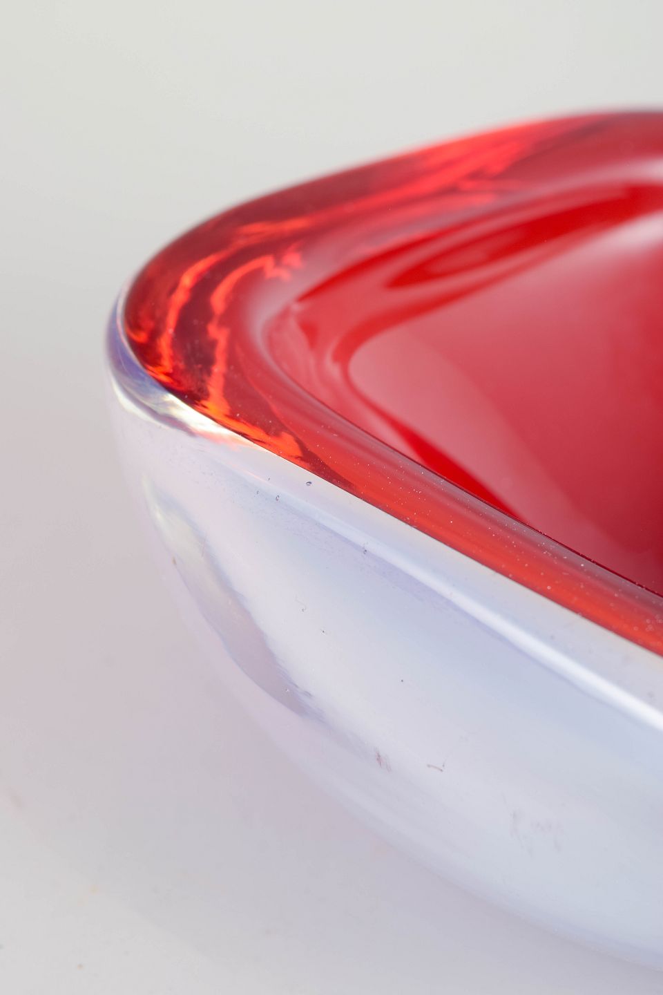 Organic freeform hand-blown bowl in layered sommerso technique, featuring a ruby red interior encased in opaline white glass — an elegant and sculptural example of classic Murano studio glass.