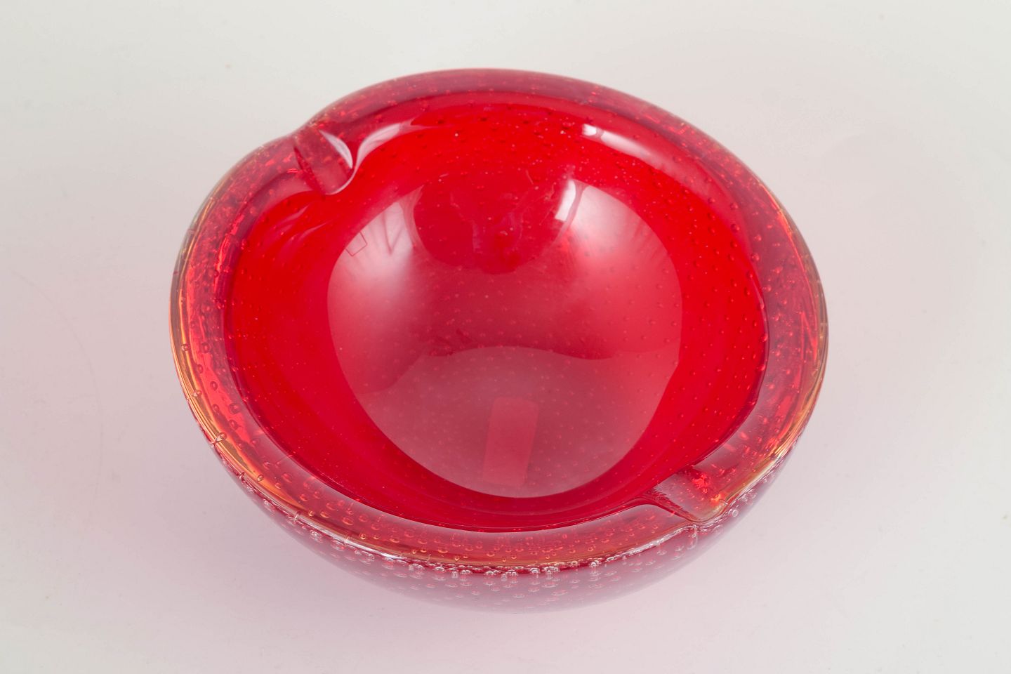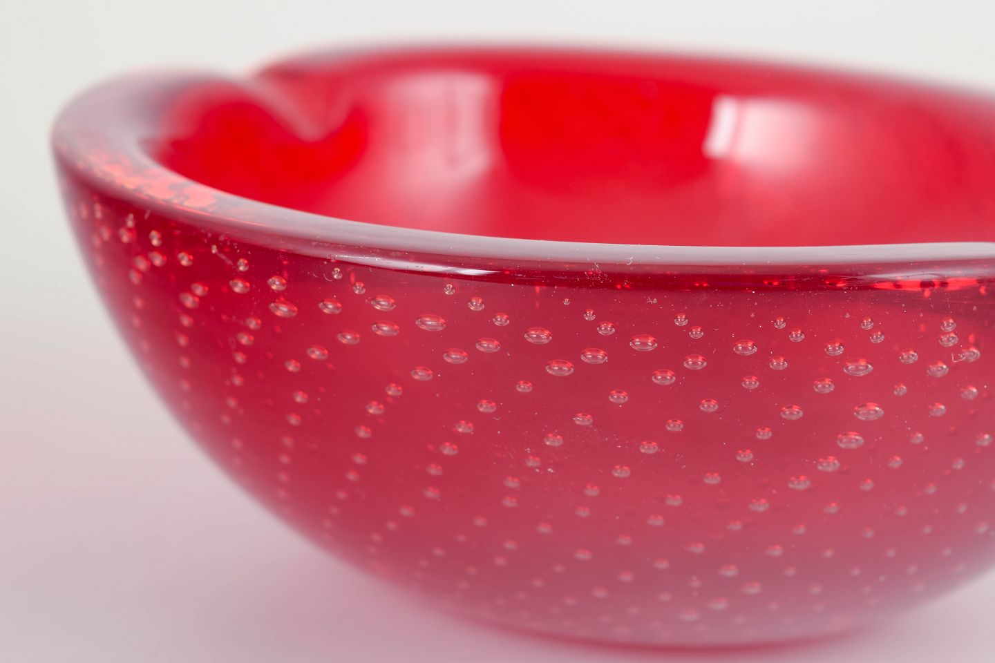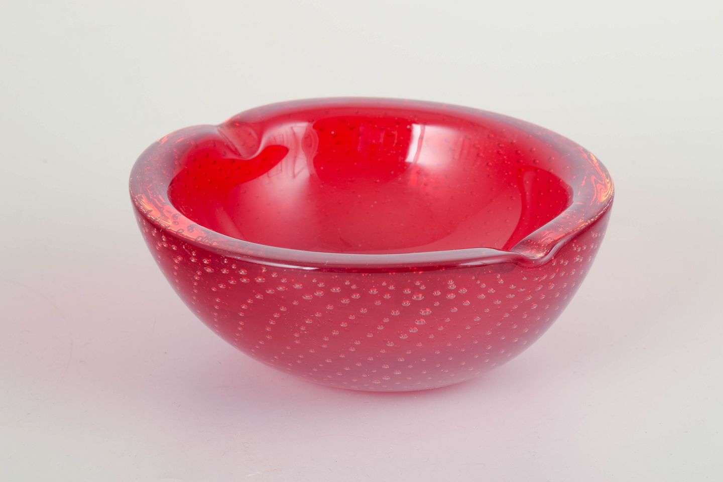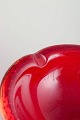 Organic freeform hand-blown bowl in red sommerso glass with trapped air-bubble pattern (bullicante), characteristic of Italian Murano glassmaking.