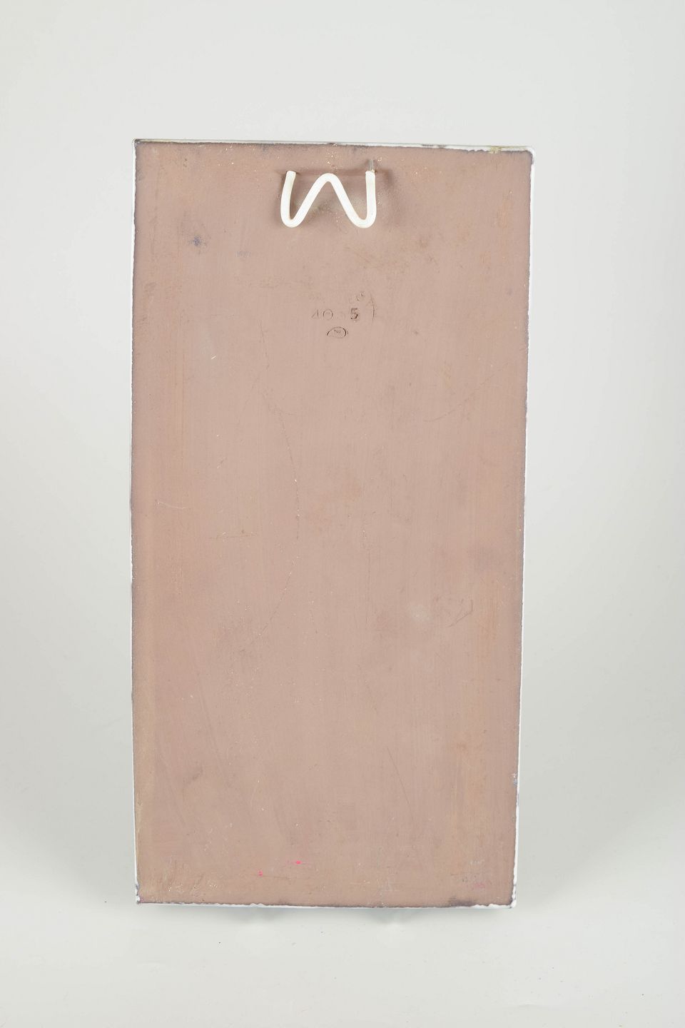 Rektangulært modelleret keramikfad med håndmalet, stiliseret kvindeportræt i modernistisk formsprog og blomstermotiv. Model 4033.