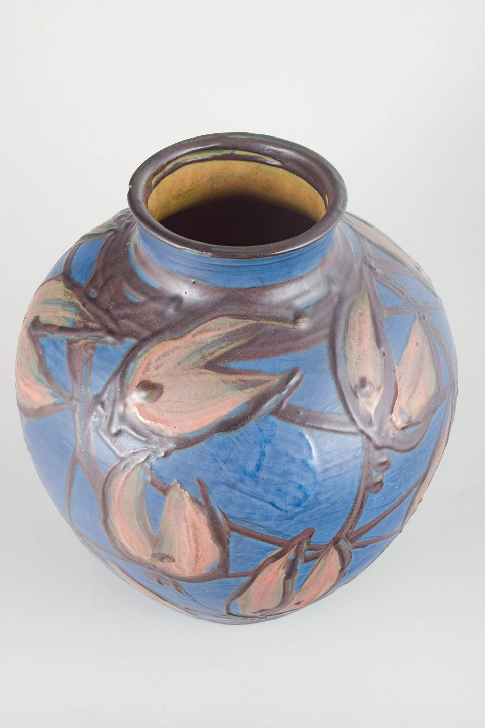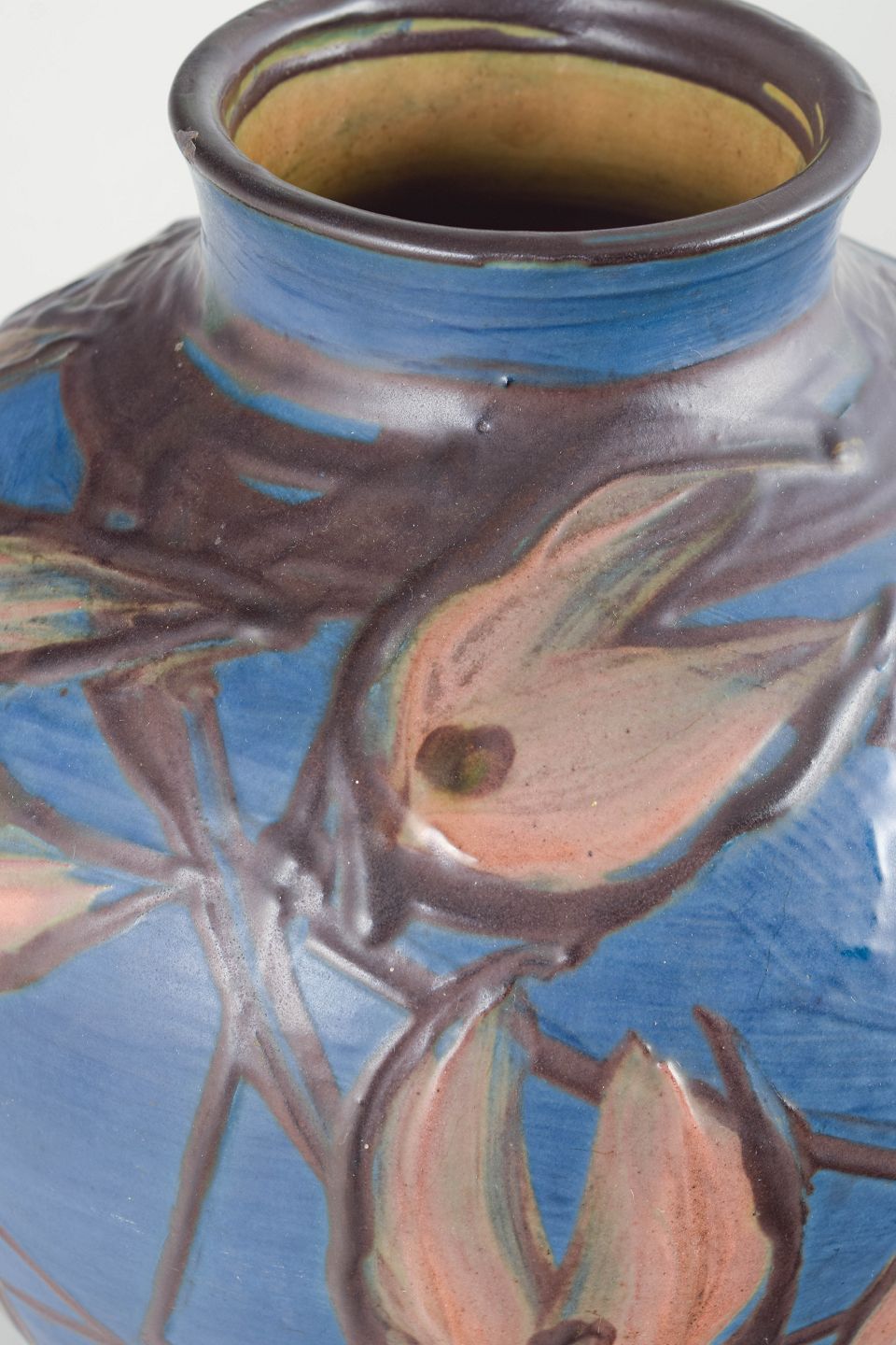 Large hand-thrown stoneware vase with a rich deep blue glaze and hand-painted floral decoration in pink and brownish tones — characteristic of Kähler’s decorative production from the early 20th century. Monumental sculptural presence.