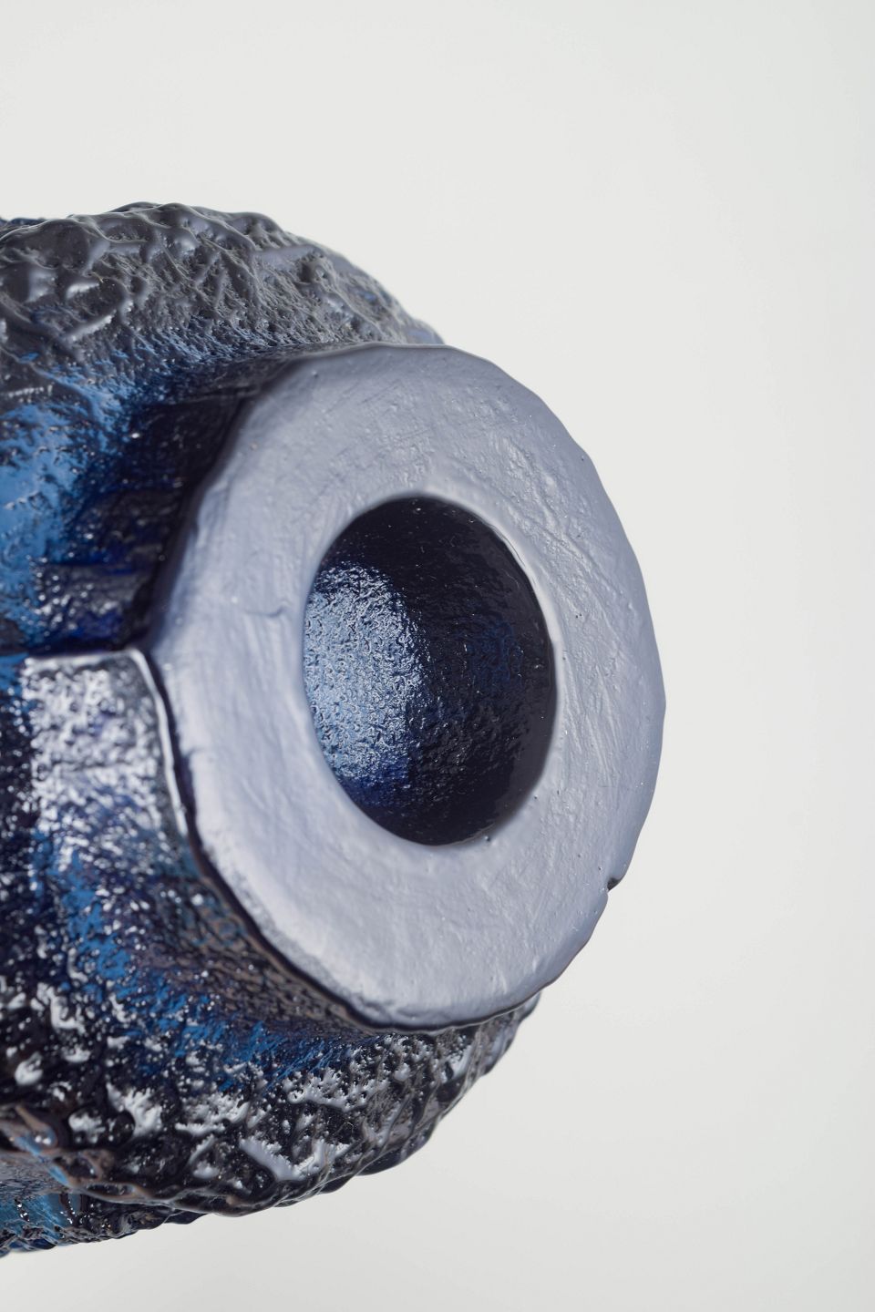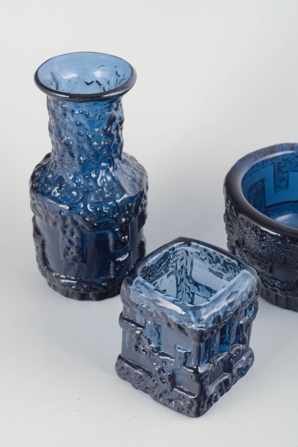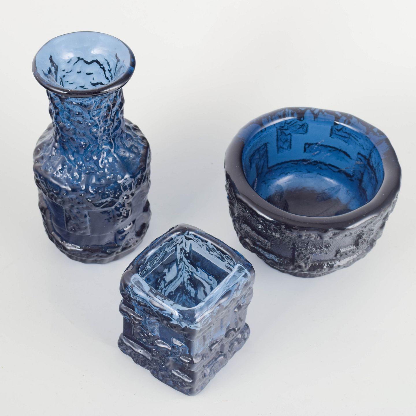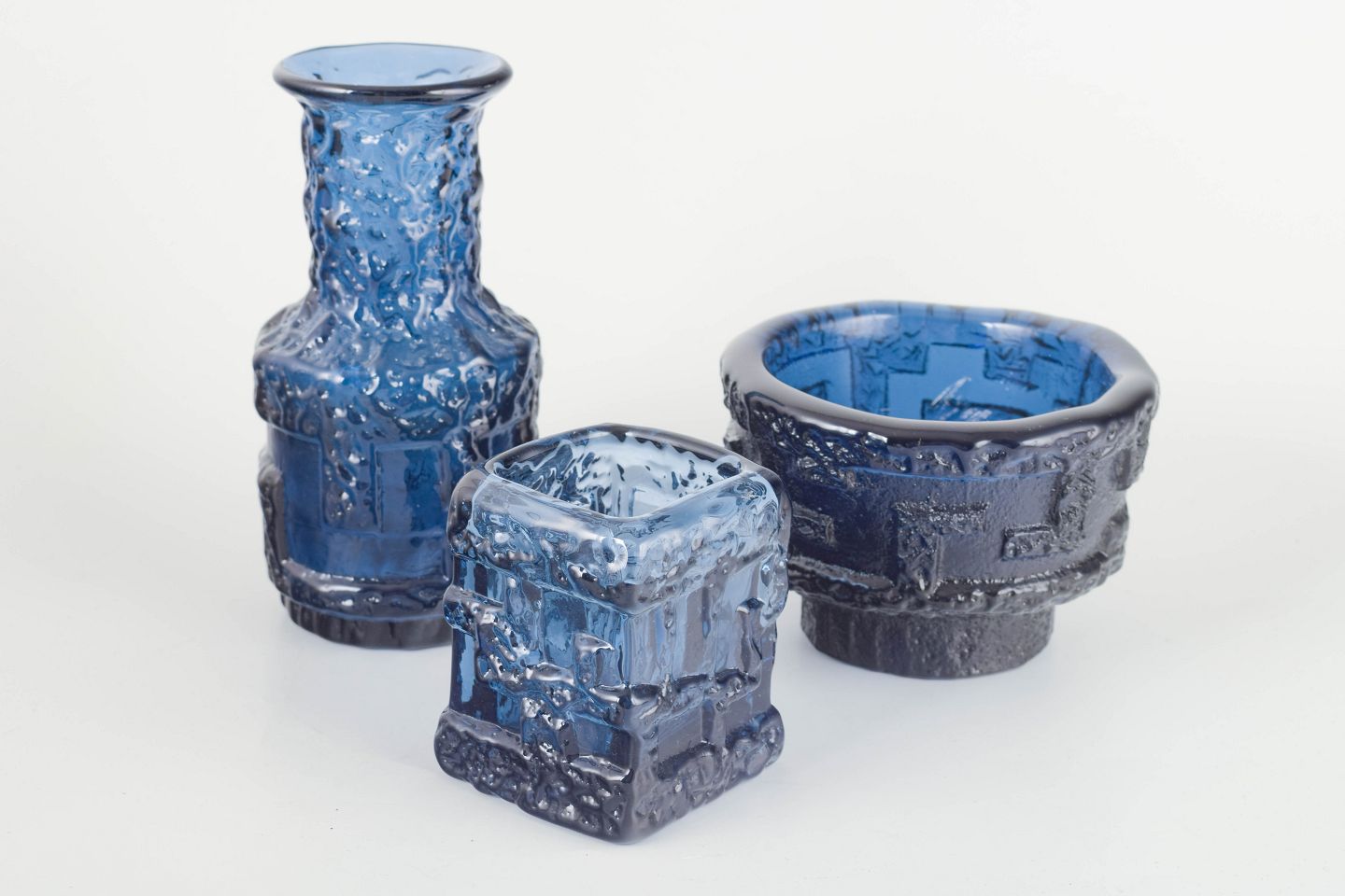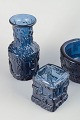 Mouth-blown sculptural glass vases in rich cobalt blue with pronounced ice-textured relief — one tall cylindrical vase, one square form and one bowl-shaped piece. A signature brutalist expression from Ruda Glasbruk in the 1970s.
