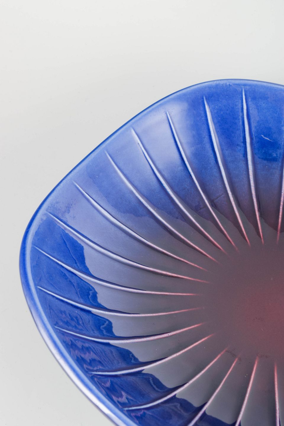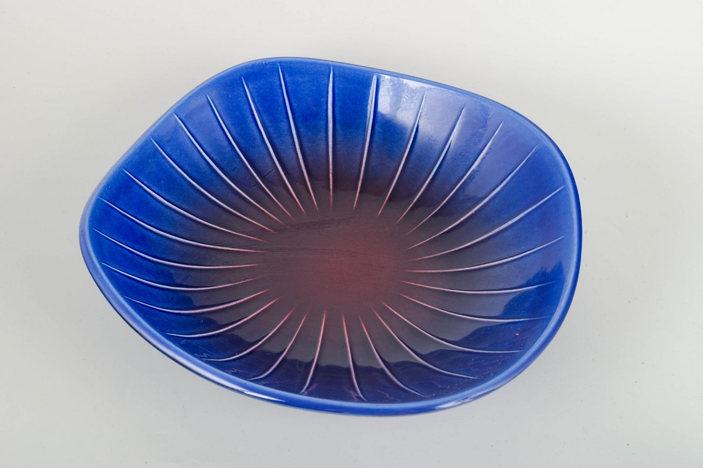 Sculptural and organically shaped stoneware bowl with elegantly sweeping form and a deep blue glaze with subtle purplish tones at the centre. Interior features a radiating incised pattern inspired by the Sparaxis flower — an iconic example from Stålhane’s botanically inspired series.