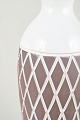Retro-styled tall vase in glazed faience with white top and base and a geometric hand-decorated panel in a brownish/lilac tone with diagonal lattice pattern.