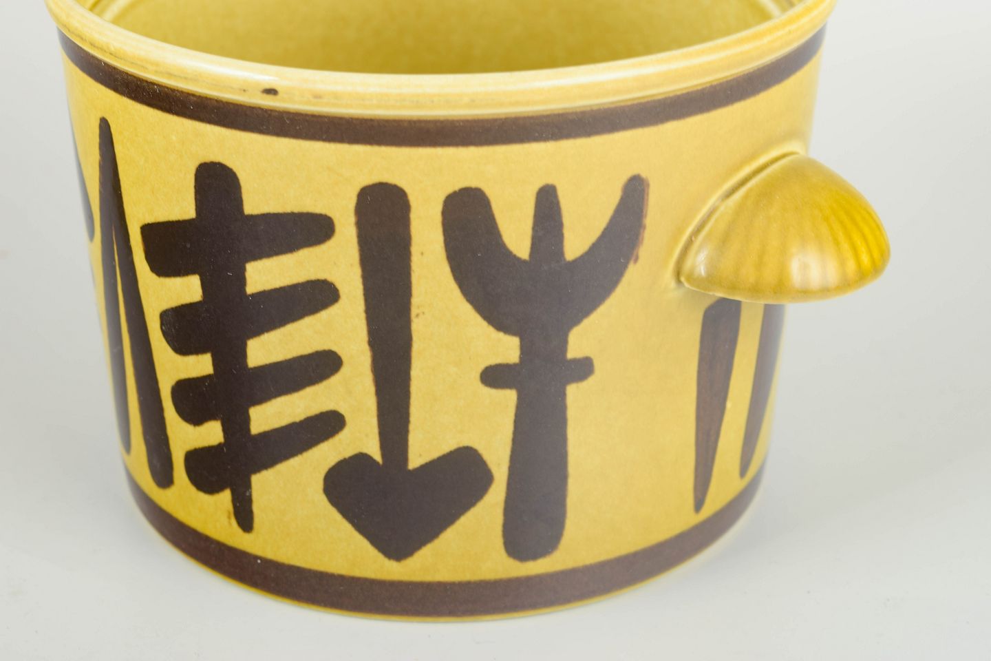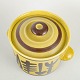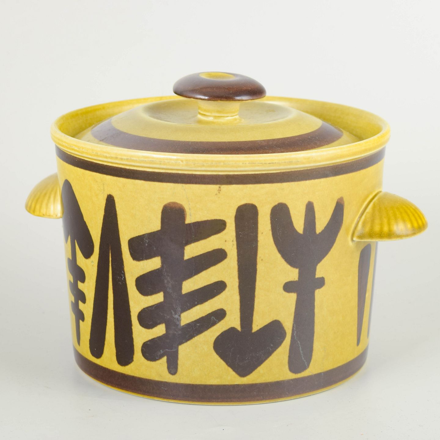 Retro lågterrin i glaseret fajance med håndmalet dekor i stærke gul/brune toner, karakteristisk for serien “Pang”. Med originale sidehåndtag og låg.