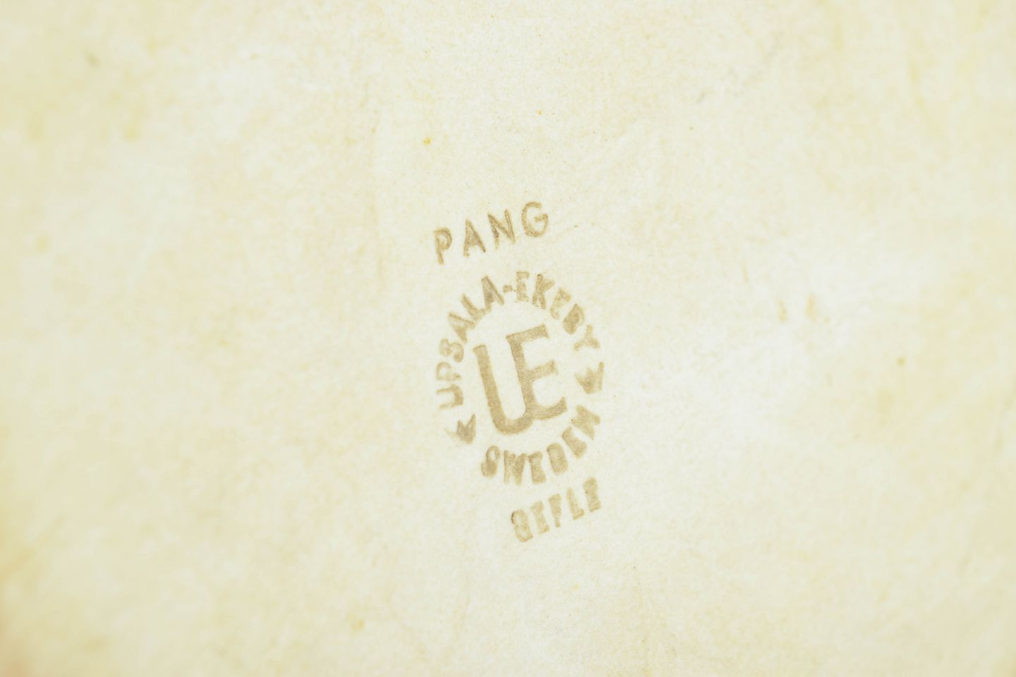 Upsala-Ekeby var en af Sveriges førende keramikfabrikker fra begyndelsen af 1900-tallet og især kendt for deres kunstneriske og dekorative fajanceproduktion i midten af århundredet. I 1930’erne opkøbte de Gefle, og under 1950-70’erne blev fabrikken et centrum for moderne skandinavisk design med kunstnere som Mari Simmulson, Ingrid Atterberg og Hjördis Oldfors. Serien “Pang” er et typisk eksempel på den farverige og legende stil fra denne periode.