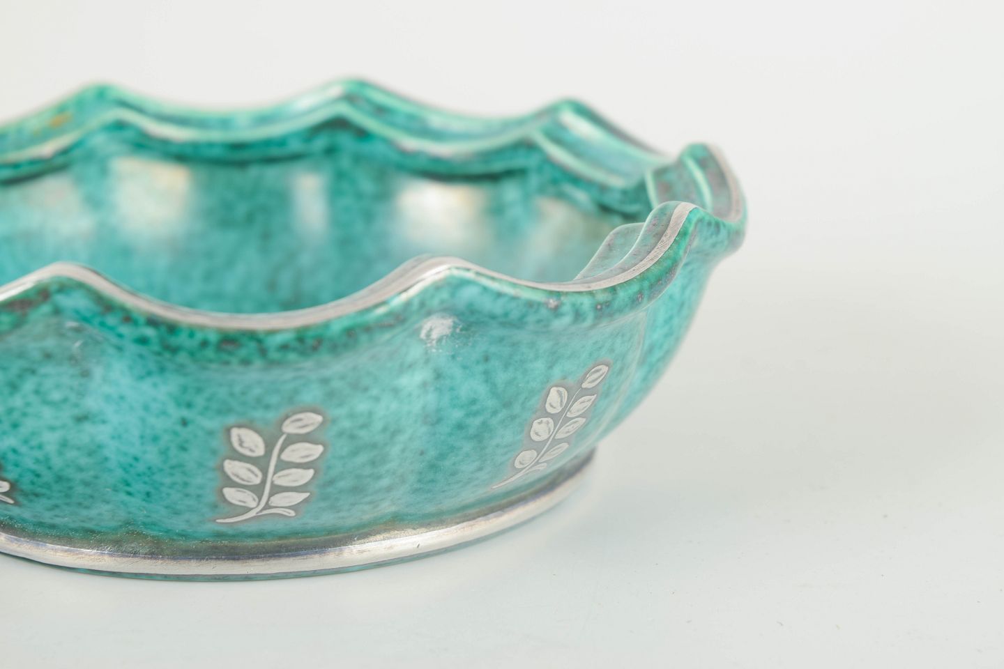 Low round bowl in turquoise-glazed stoneware with silver inlays along the sides and in the bottom. Slightly undulating, press-moulded rim.