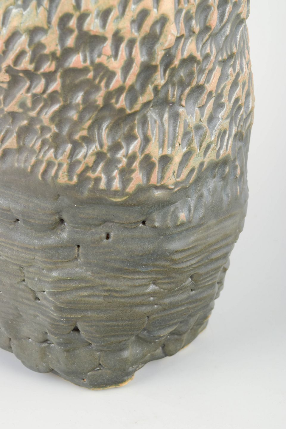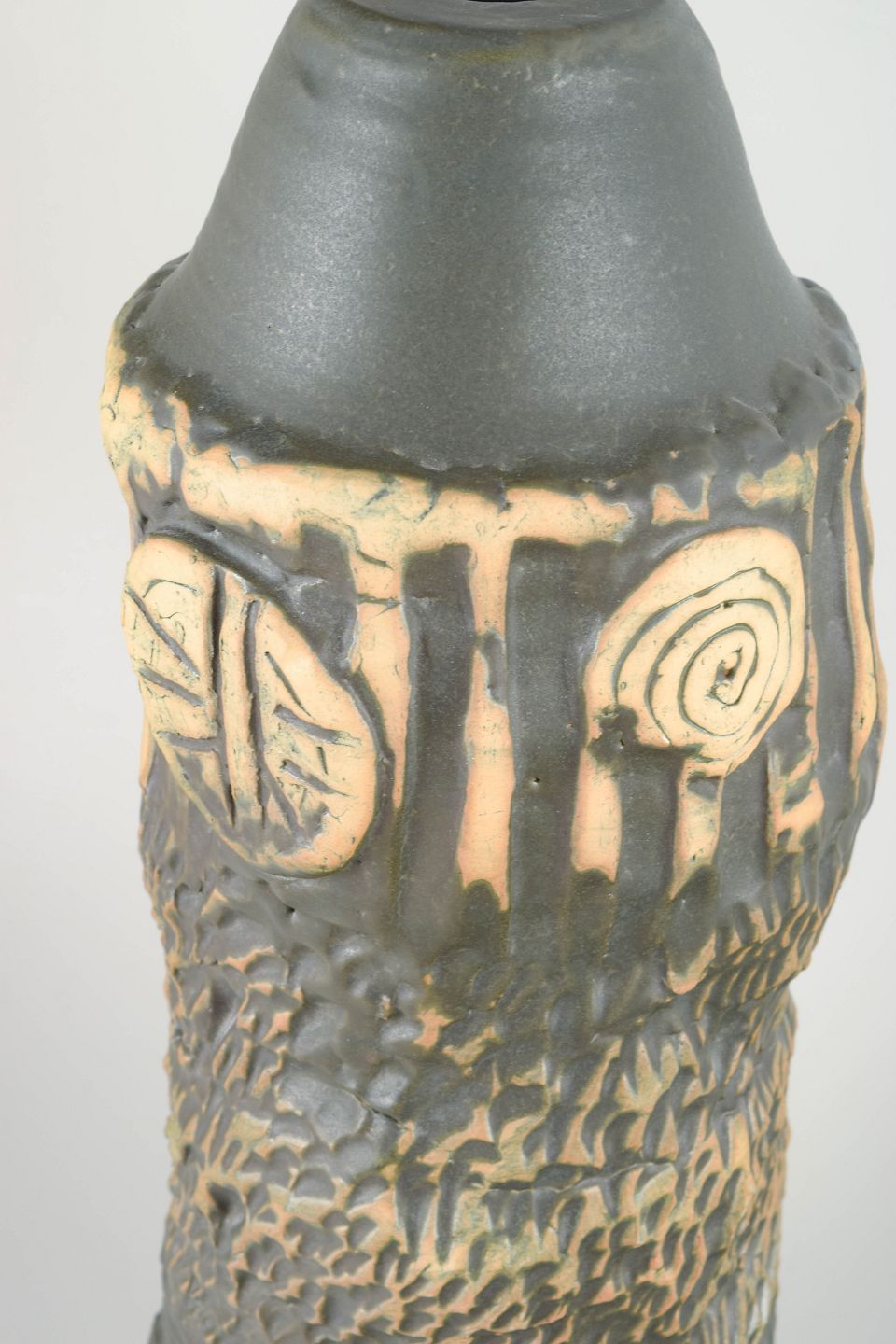 Large, sculptural floor vase in hand-built stoneware with a raw, heavily textured surface and relief ornamentation in beige and light pink tones against a dark greyish body.