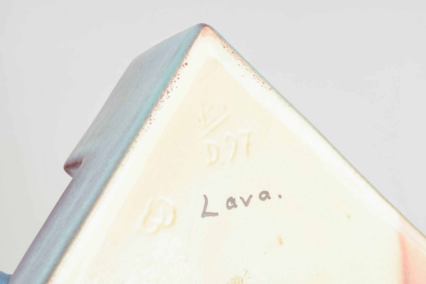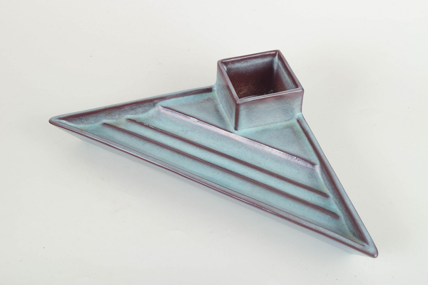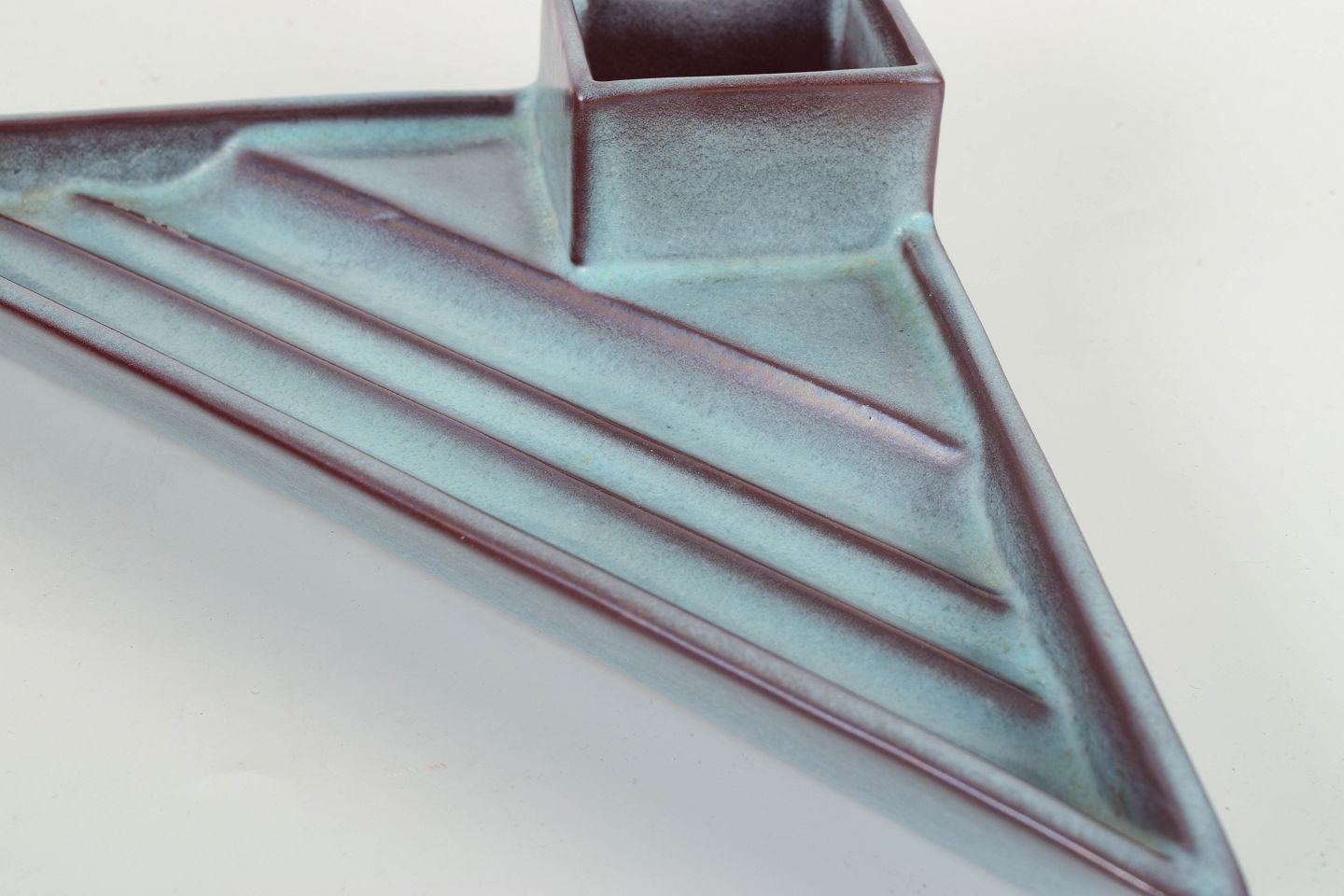 Rare Art Deco pen tray in glazed faience with geometric, architectural form and experimental lava-style glaze in blue-violet tones.
