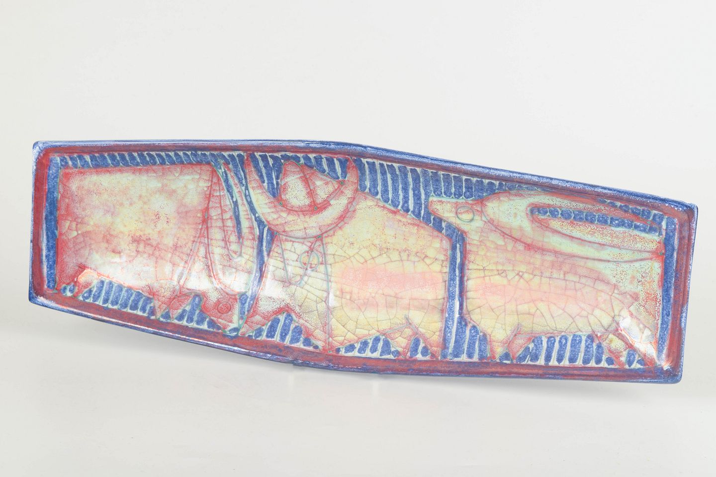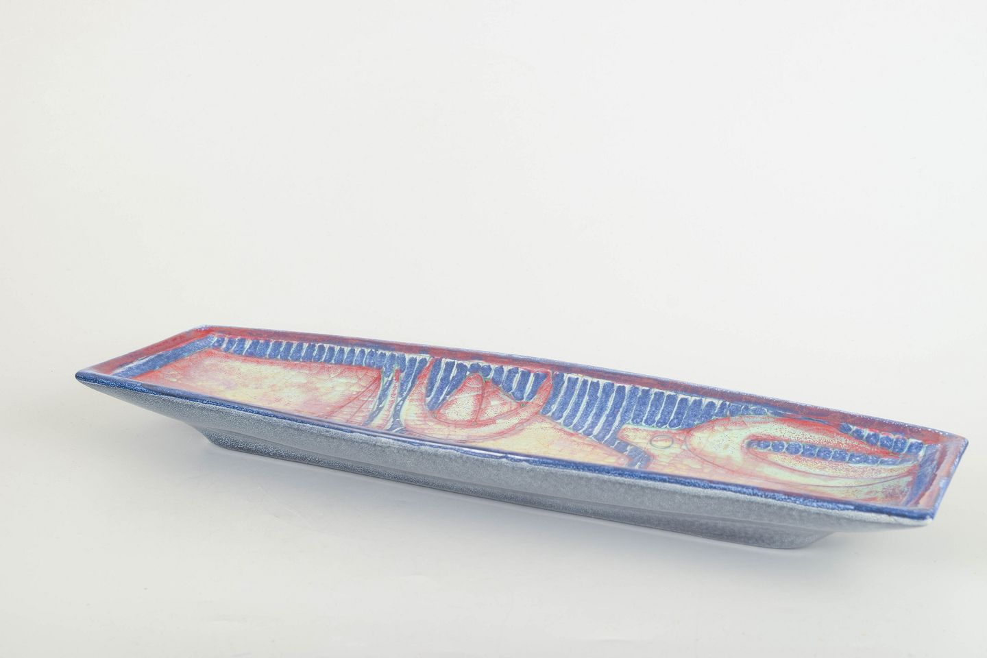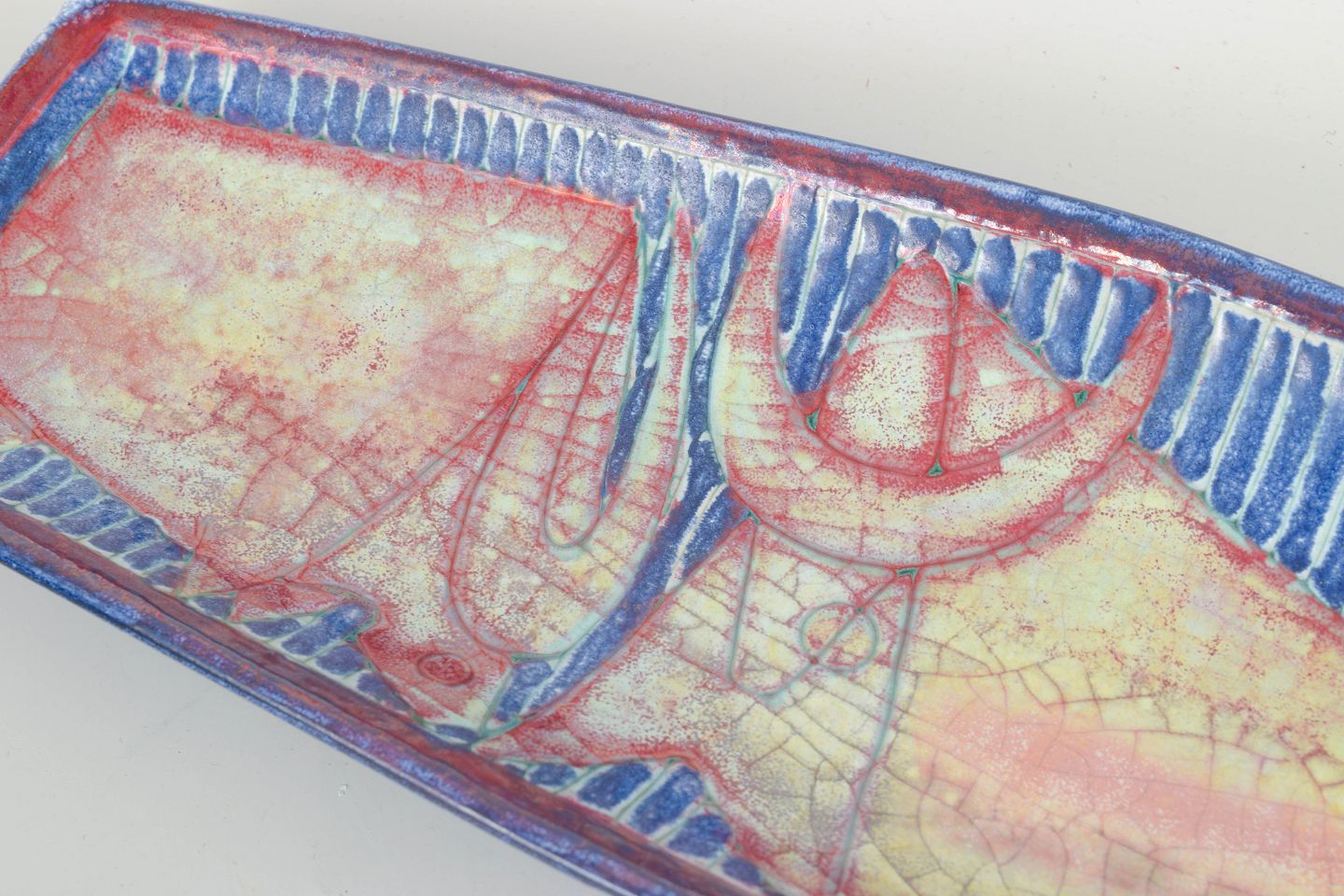 Elongated rectangular stoneware dish with characteristic graphic decoration in red-pink and cobalt-blue tones with pronounced craquelure — a signature of Starck’s modernist expression for Bornholm-based Michael Andersen.