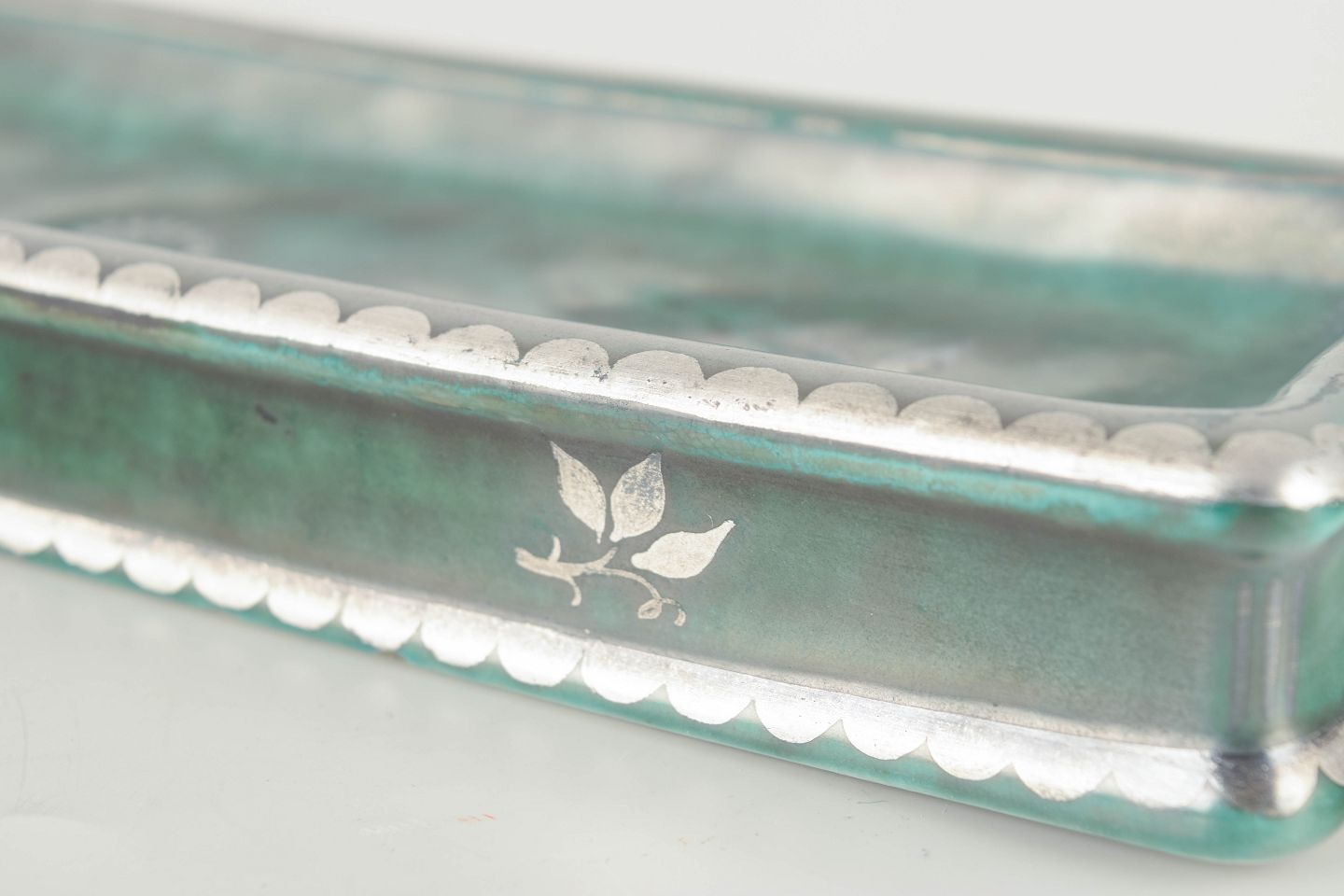 Rectangular Art Deco pen tray in glazed stoneware with Gustavsberg’s signature turquoise Argenta glaze and inlaid silver decorations of stylised floral and leaf motifs.