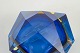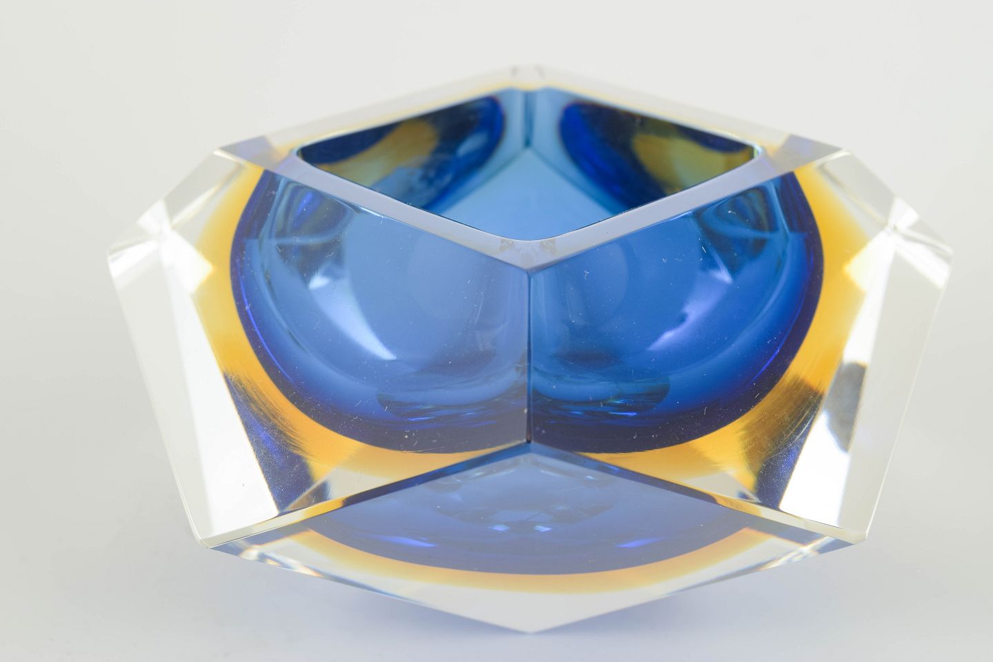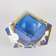 Heavy geometric bowl in solid Murano crystal glass with layered optical colour in blue and golden tones — a classic example of 1970s Italian Sommerso technique.