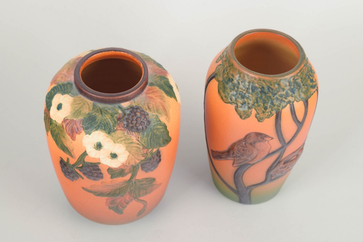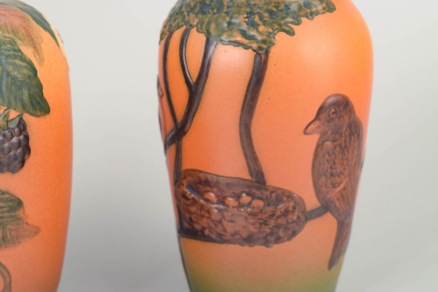 To smukt dekorerede keramikvaser fra Ipsens Enke, hver med reliefdekoration. Den ene vase viser brombærgrene med blomster og frugter, mens den anden har motiv af fugl og rede i træ. Begge i varme orange og grønne toner med mat glasur og klassisk art deco-udtryk.