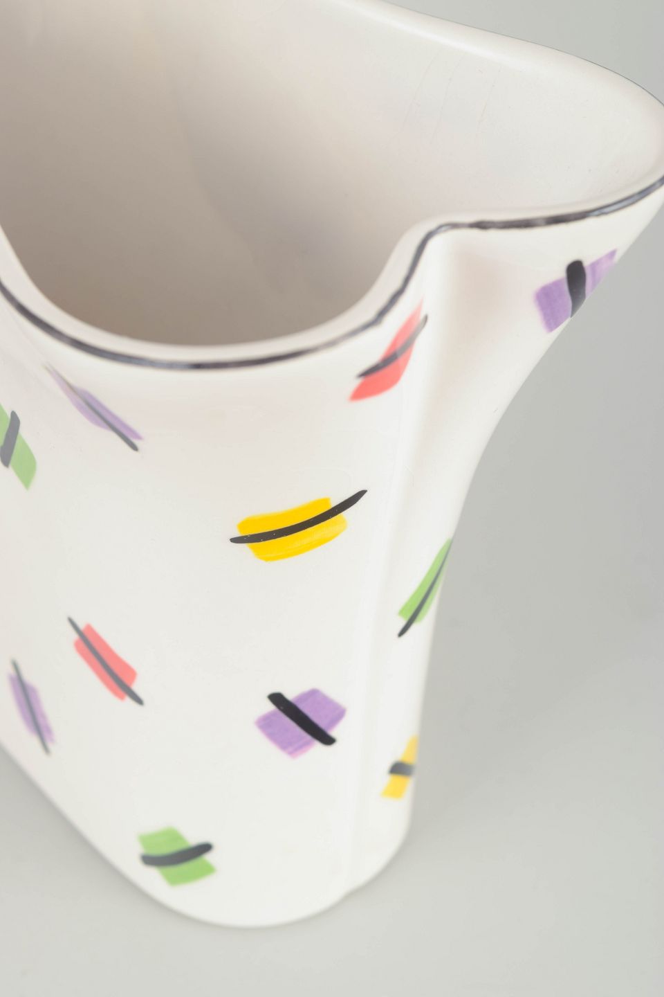 Faiencevase i karakteristisk Memphis-stil med bølgende form og håndmalet dekoration i klare farver – grøn, lilla, gul og rød – på hvid baggrund med sort kant. Et livligt og legende eksempel på Rönndahls design for Gustavsberg i 1980’erne.