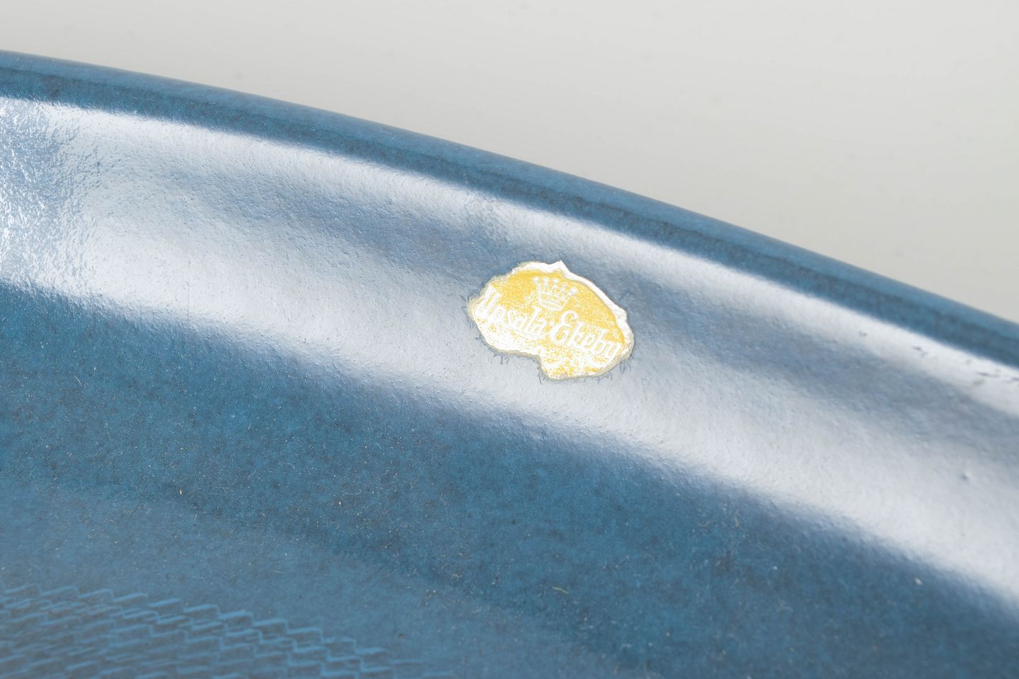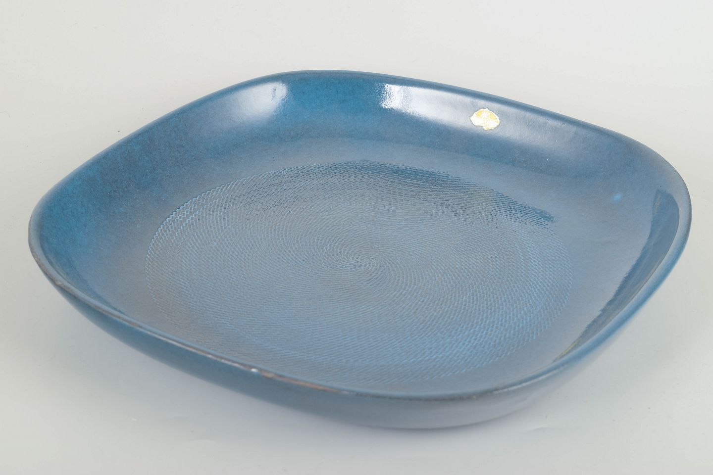 Large square stoneware dish with rounded corners and a beautiful blue glaze featuring a spiral decoration at the centre. A fine example of Upsala Ekeby’s 1960s design, combining functionality and aesthetic simplicity.