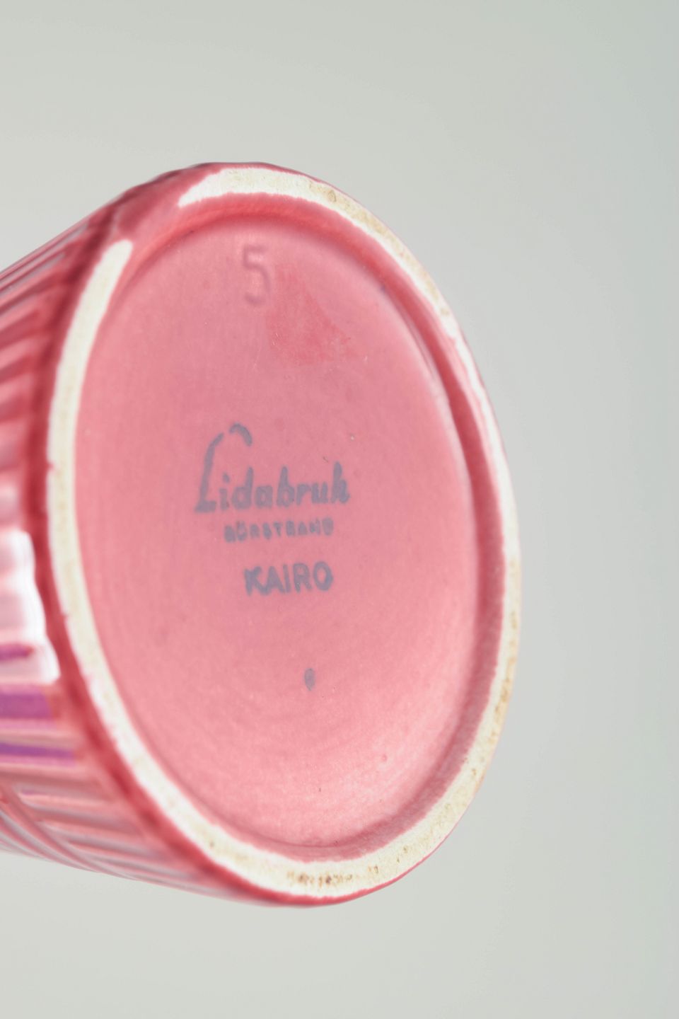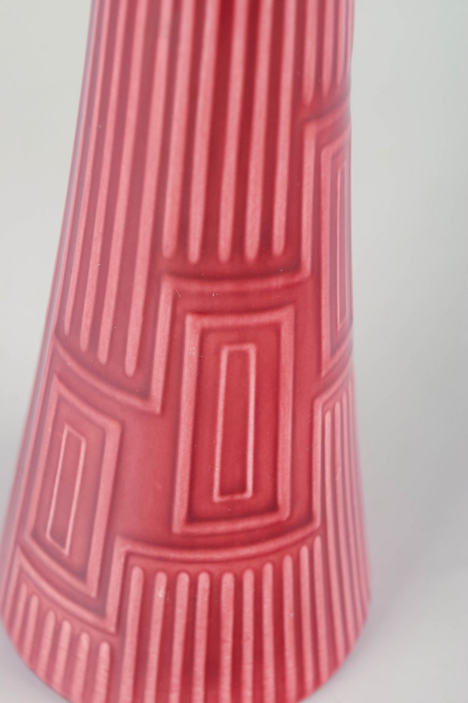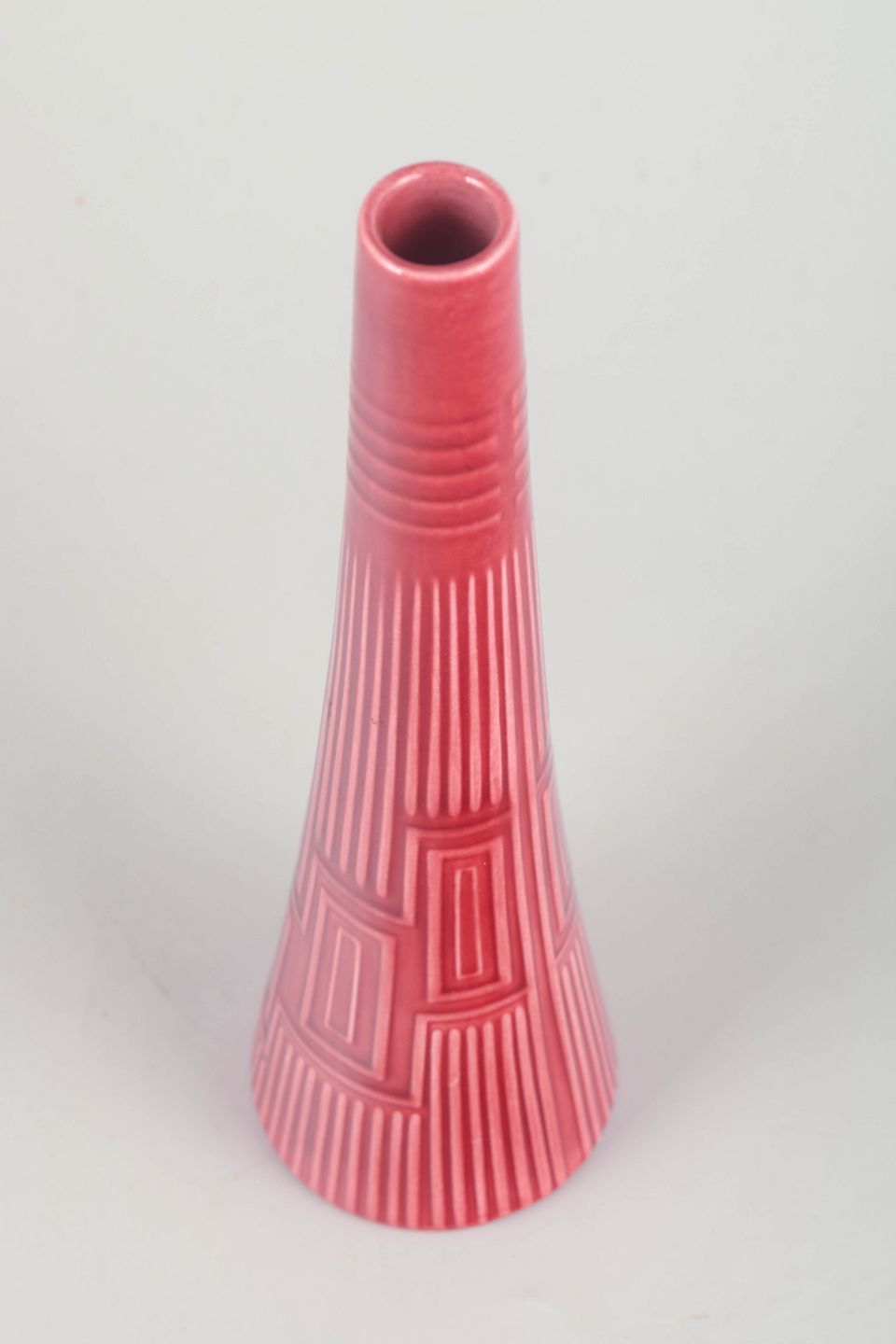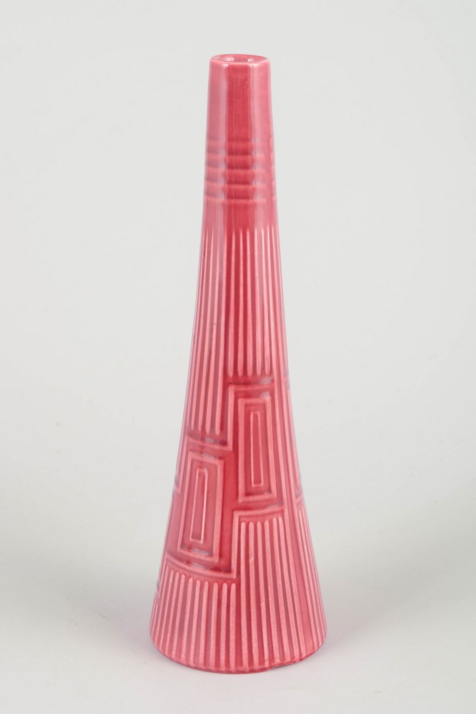Rare conical ceramic vase in pink glaze with geometric relief pattern and vertical ridges. Marked “Lidabruk Rörstrand Kairo” to the base.