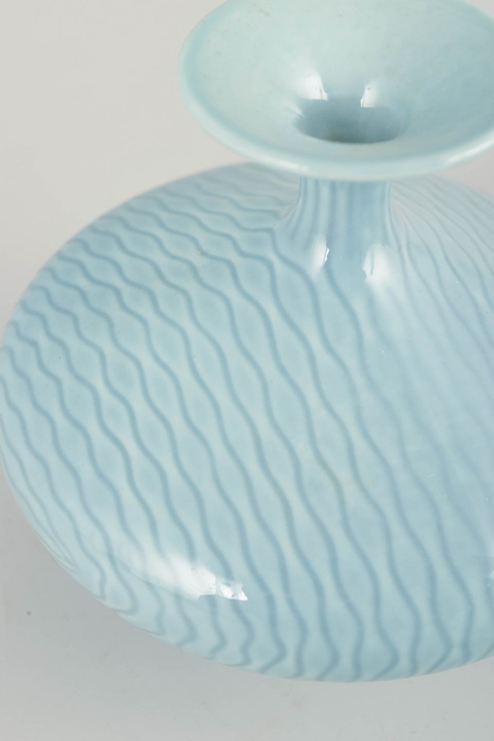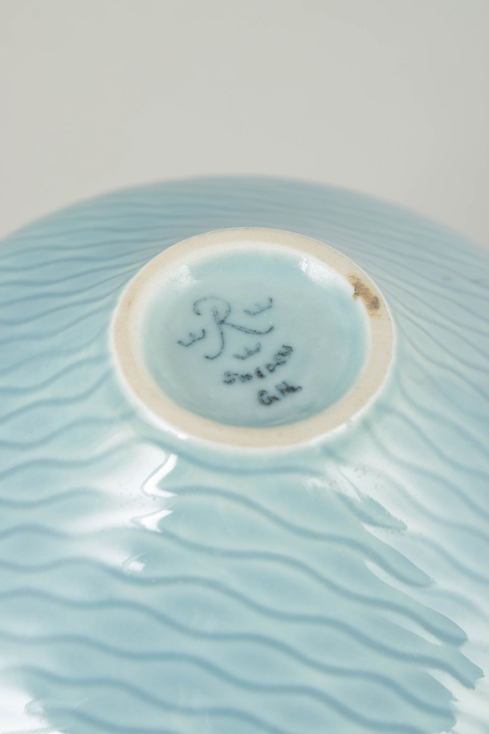 Elegant and organically shaped stoneware vase with a wavy pattern under a turquoise blue glaze. A characteristic example of Nylund’s sculptural balance and subtle glaze effects, embodying timeless Scandinavian design.