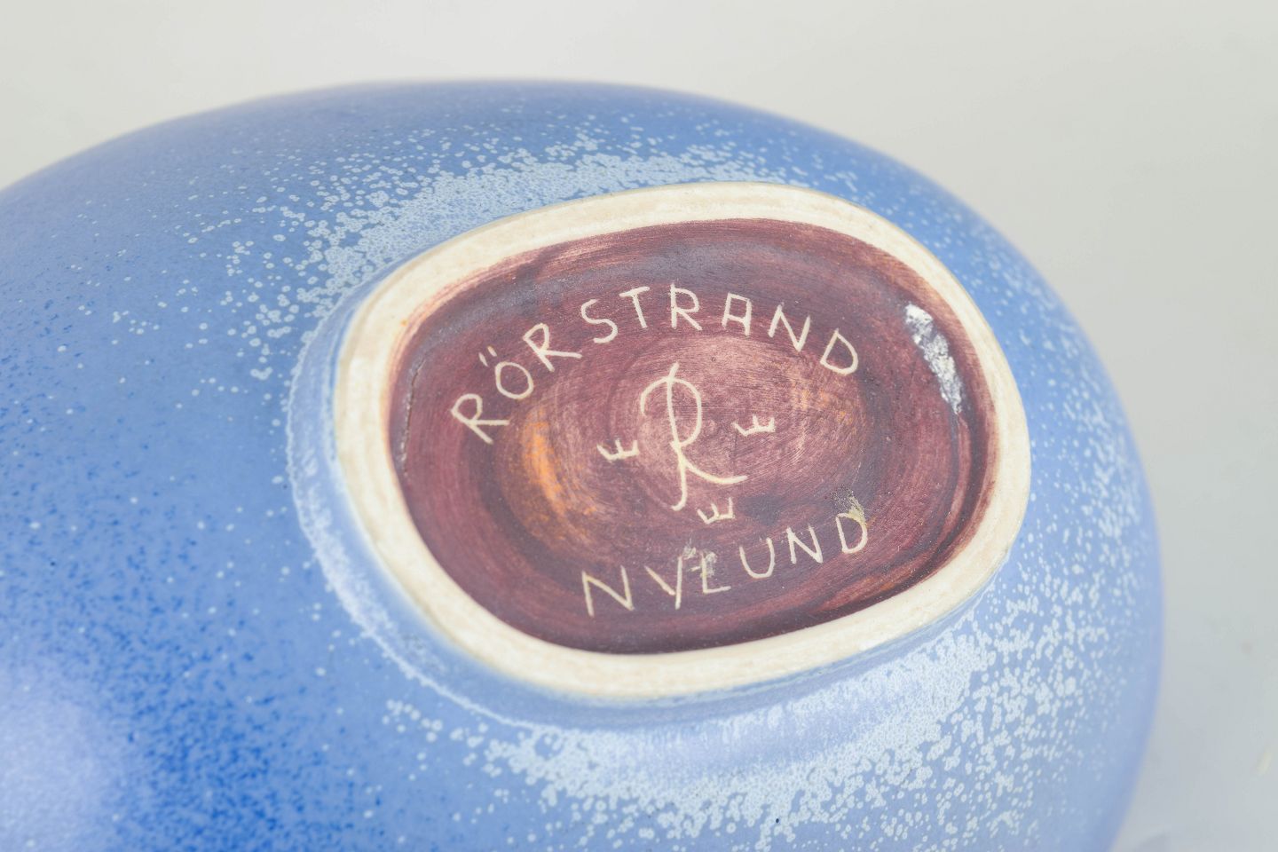 Elegant stentøjsskål med blød, organisk form og matblå glasur med fint spættet overflade — et karakteristisk eksempel på Nylunds sans for proportioner og subtile farvetoner. Skålen udstråler den rolige modernisme, som prægede Rörstrand i midten af det 20. århundrede.