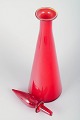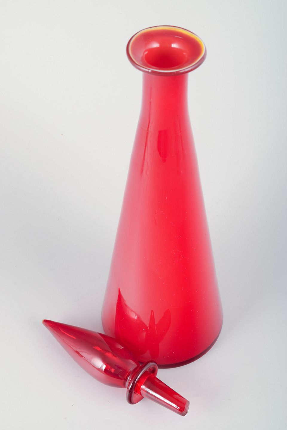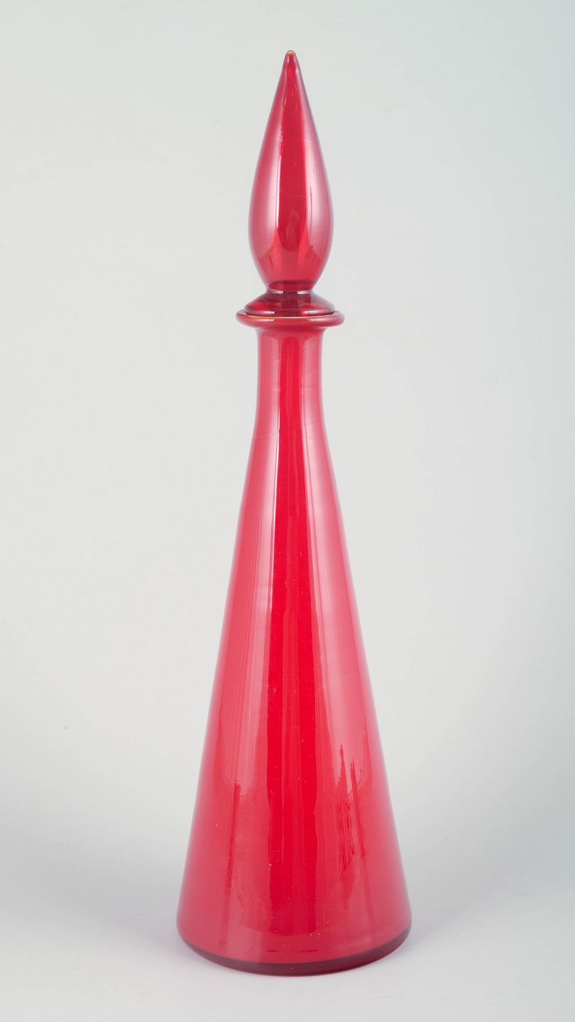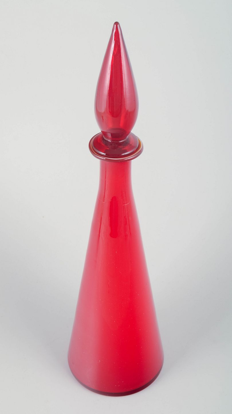 Impressive mouth-blown art glass carafe in rich red tone with a tall conical form and matching drop-shaped stopper. A classic example of Murano glass from the period, showcasing Venini’s mastery of colour and elegant simplicity.