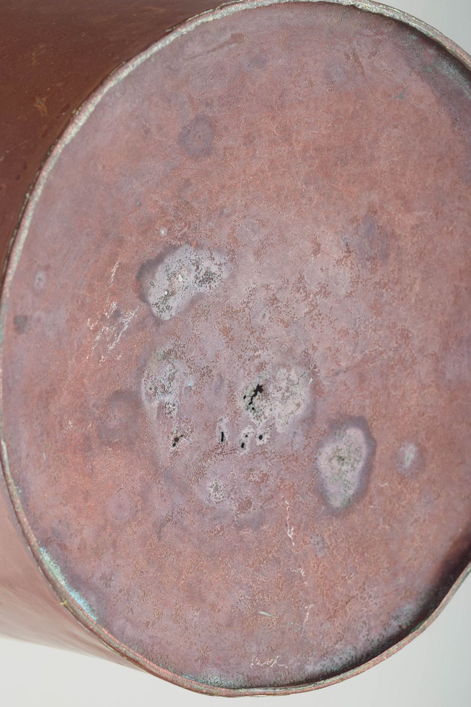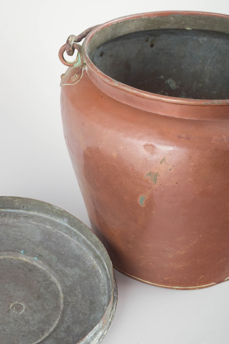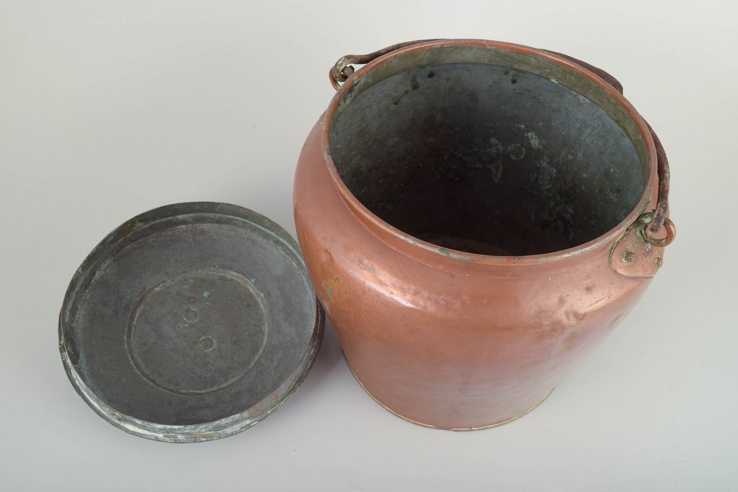 Copper maternity pail with lid and curved handle. Traditionally used in Danish households during the 18th–19th century, often as a maternity or household bucket. Displays a beautiful warm patina and age-related wear.