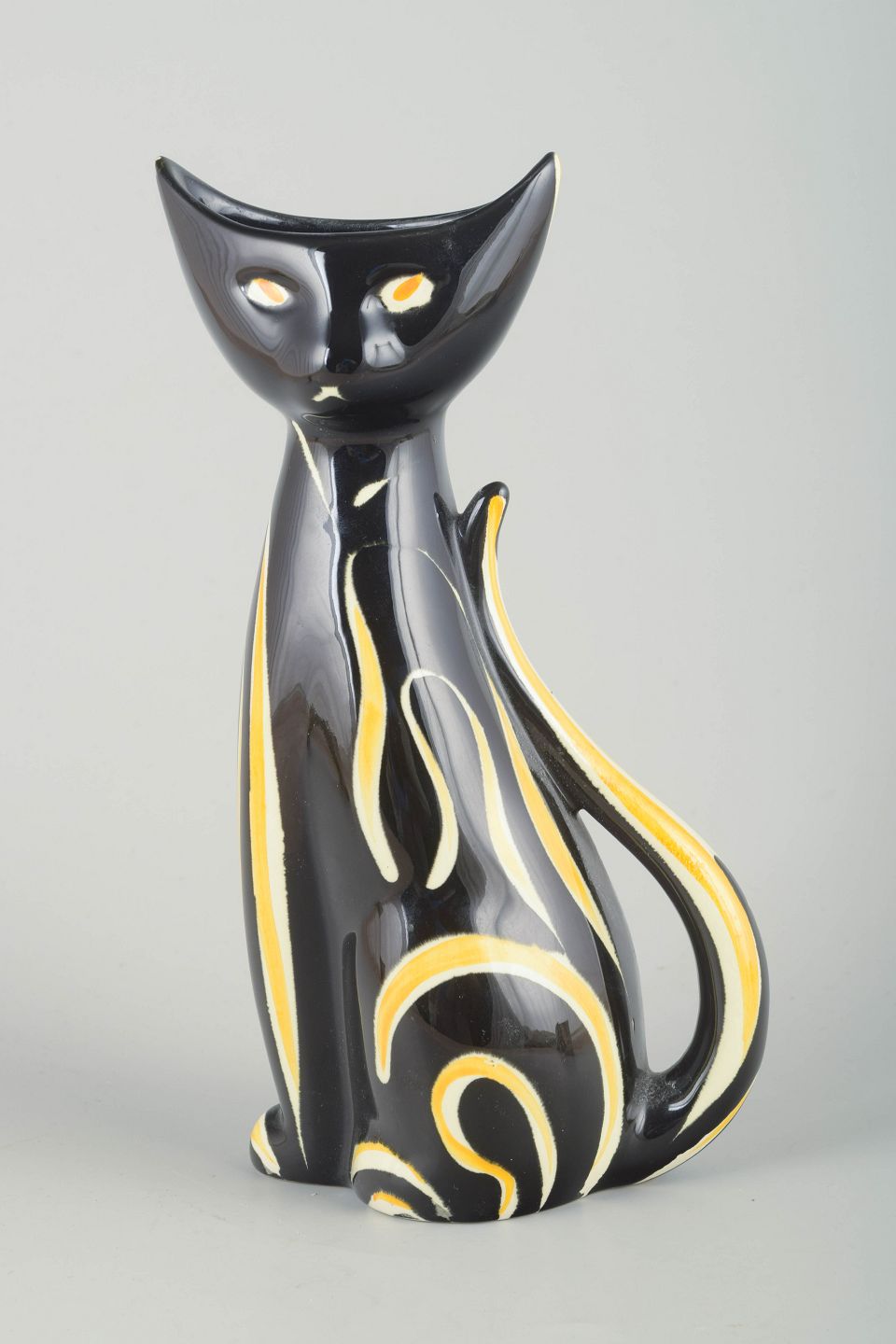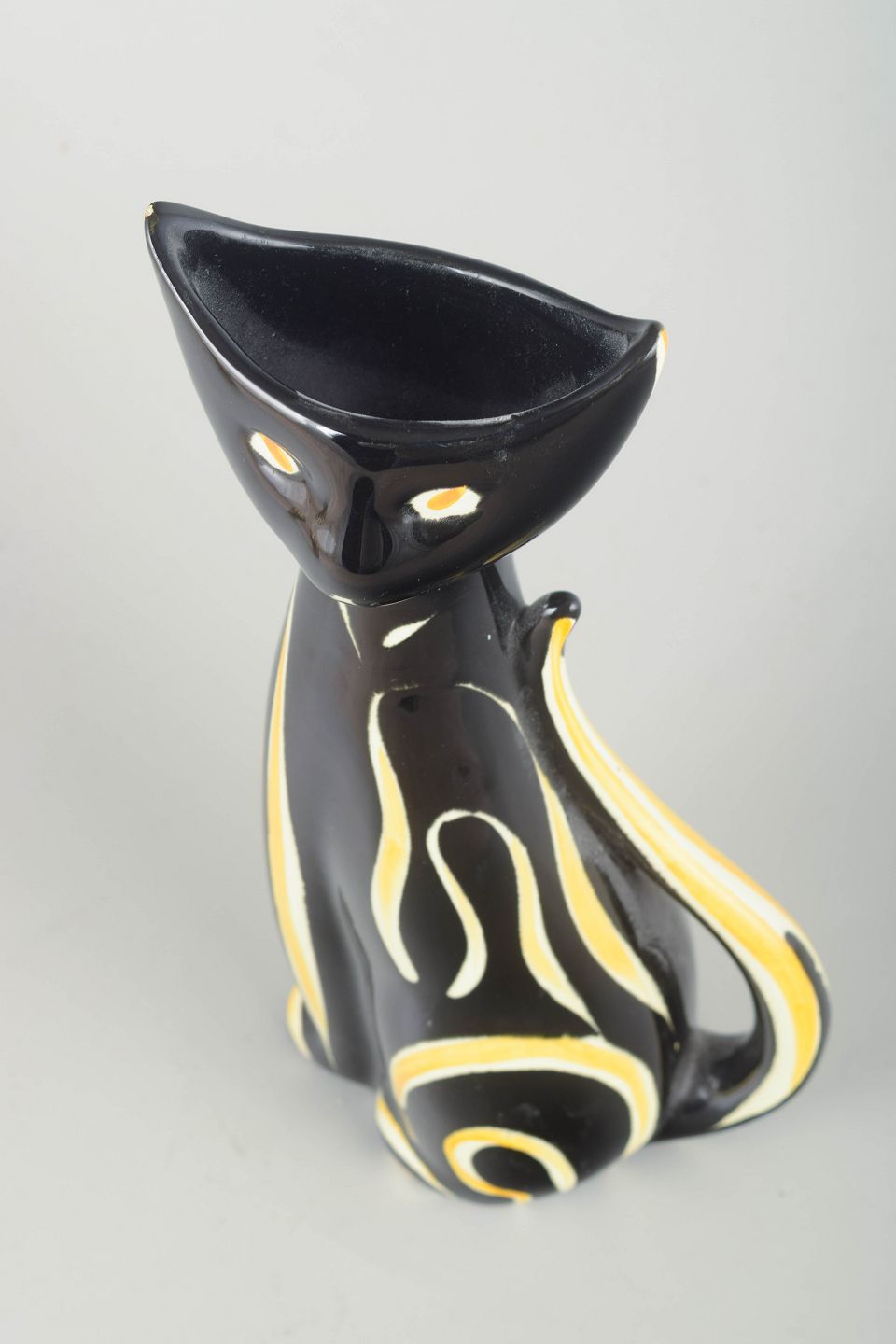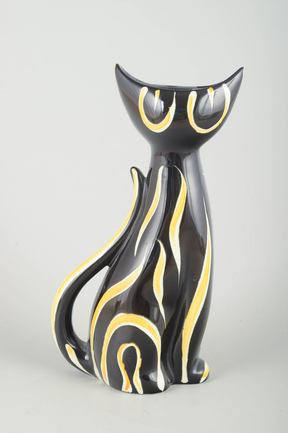 Elegant and stylised ceramic vase shaped as a cat, in black glaze with hand-painted yellow and white lines typical of 1970s design. A decorative and playful example of German studio pottery with both sculptural and functional appeal.