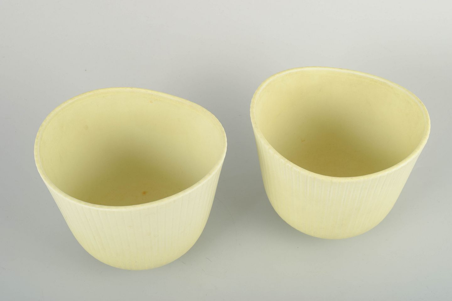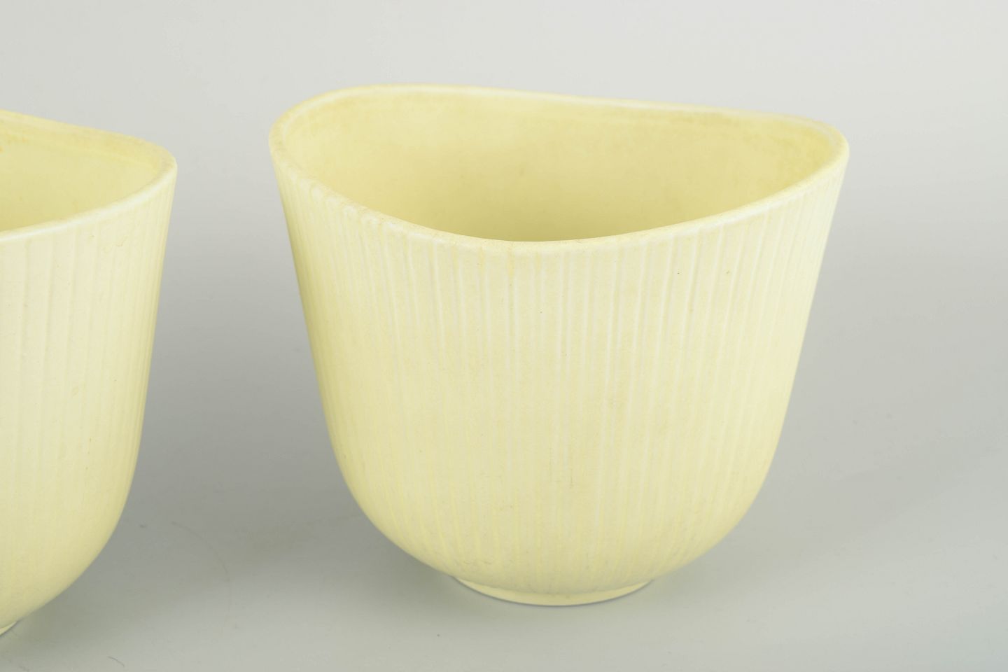 Par af keramiske blomsterkrukker i den karakteristiske “Vinda”-form med let asymmetrisk, bølgende kant og rillet struktur. Glasur i blød lysegul nuance. Stemplet “Gustavsberg Sweden” under bunden.