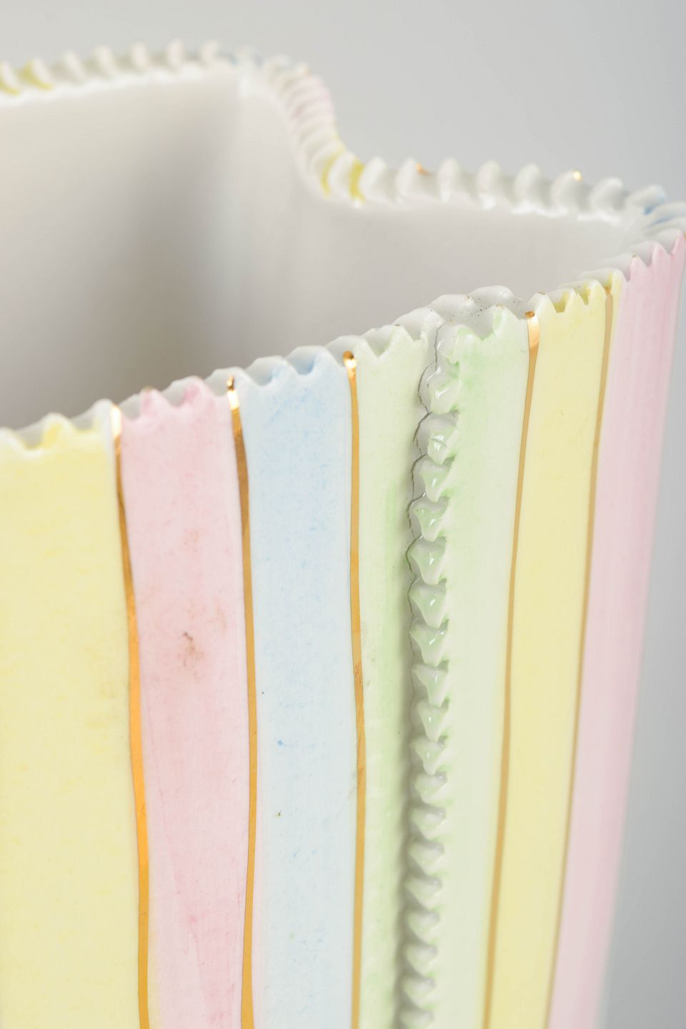 Hand-painted ceramic vase with vertical colour fields in soft pastel shades of pink, yellow, blue and green, finished with a wavy rim and a subtly asymmetric shape. A playful and decorative expression, typical of the experimental Scandinavian studio ceramics of the era.