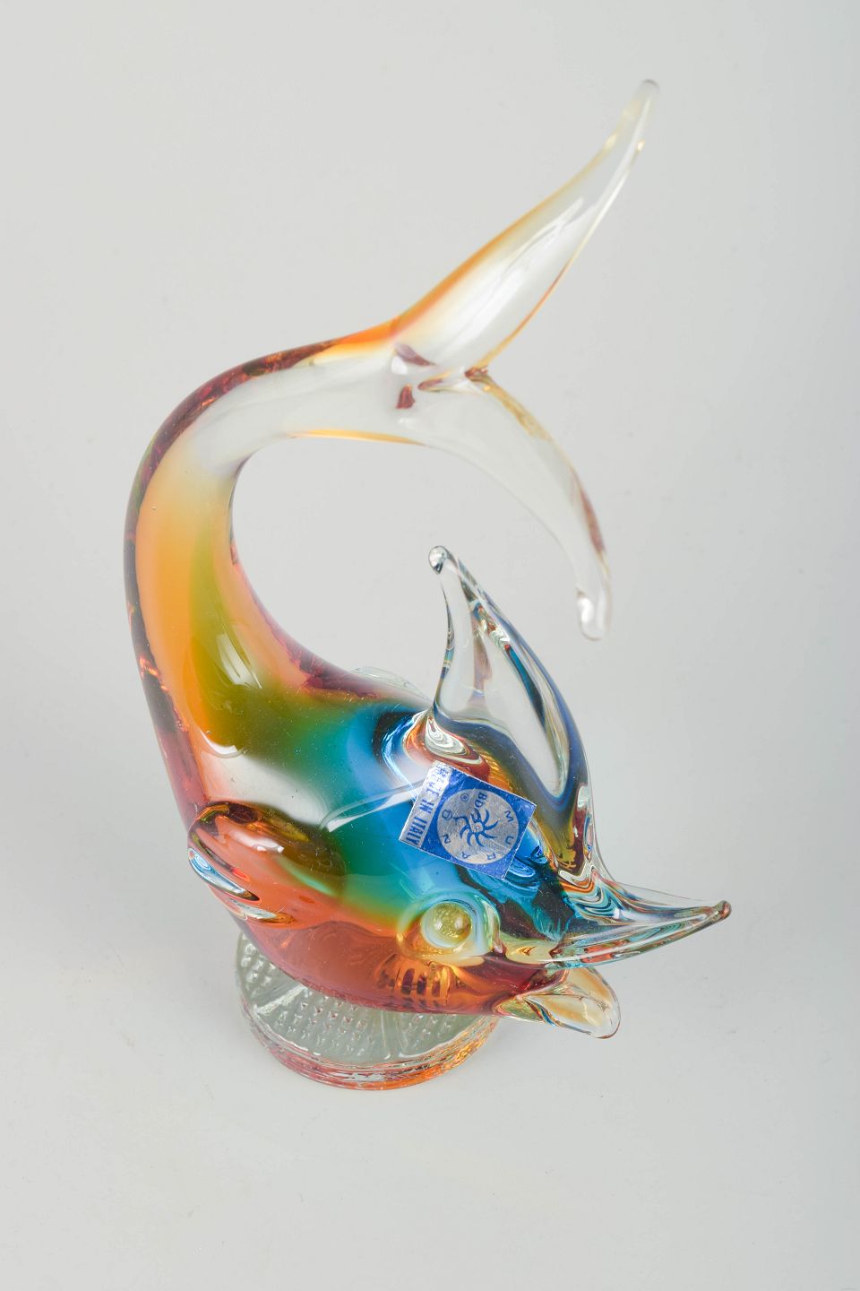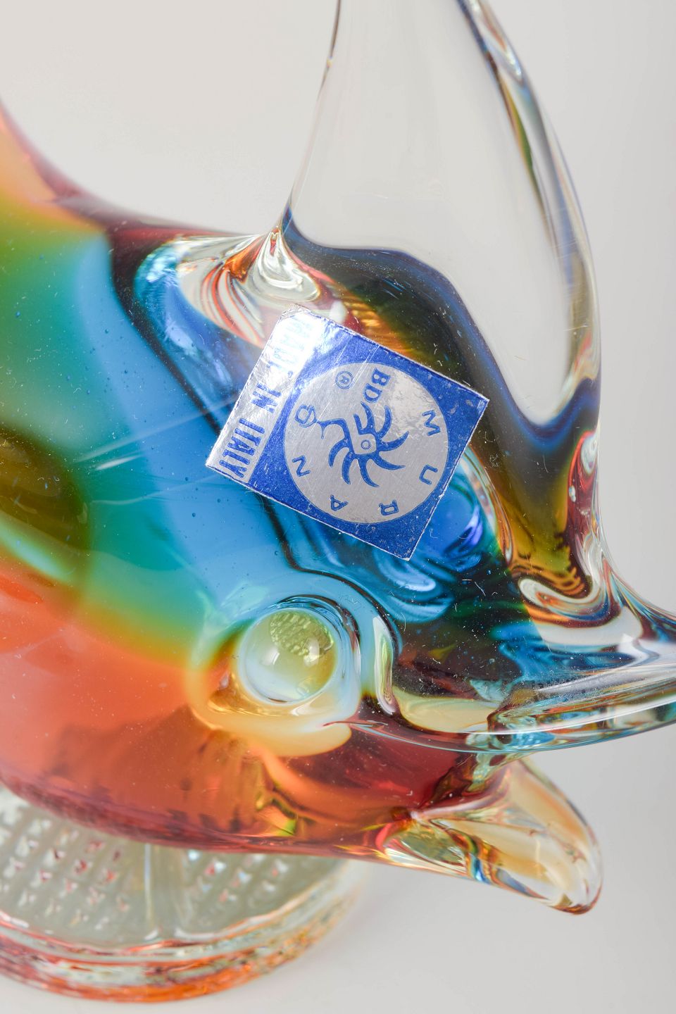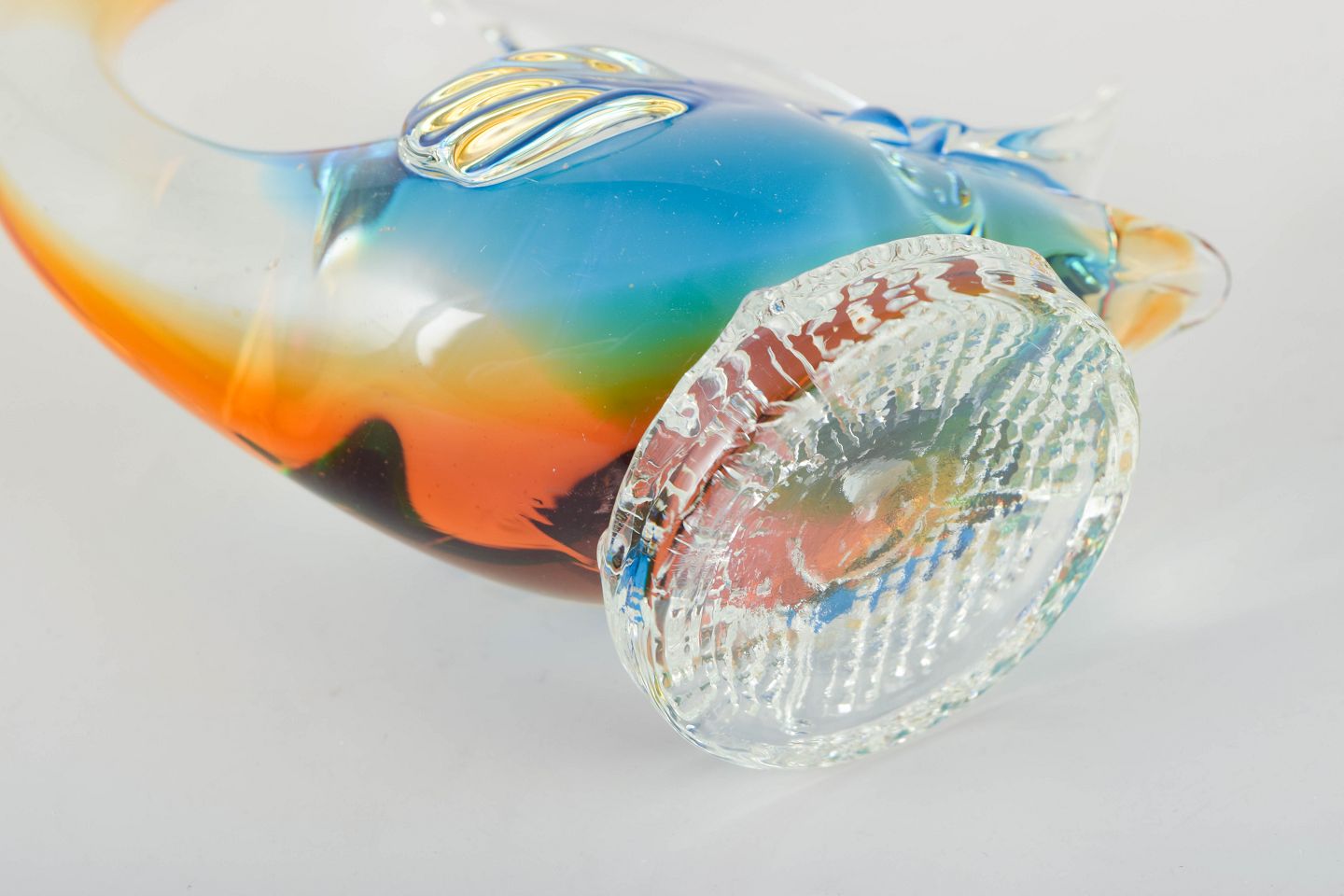 Handmade Italian glass sculpture in the form of a leaping fish, crafted in clear glass with multicoloured layers in blue, red, orange and green – a classic example of Murano craftsmanship from the period. The piece has an elegant, dynamic form and demonstrates high artisanal quality.