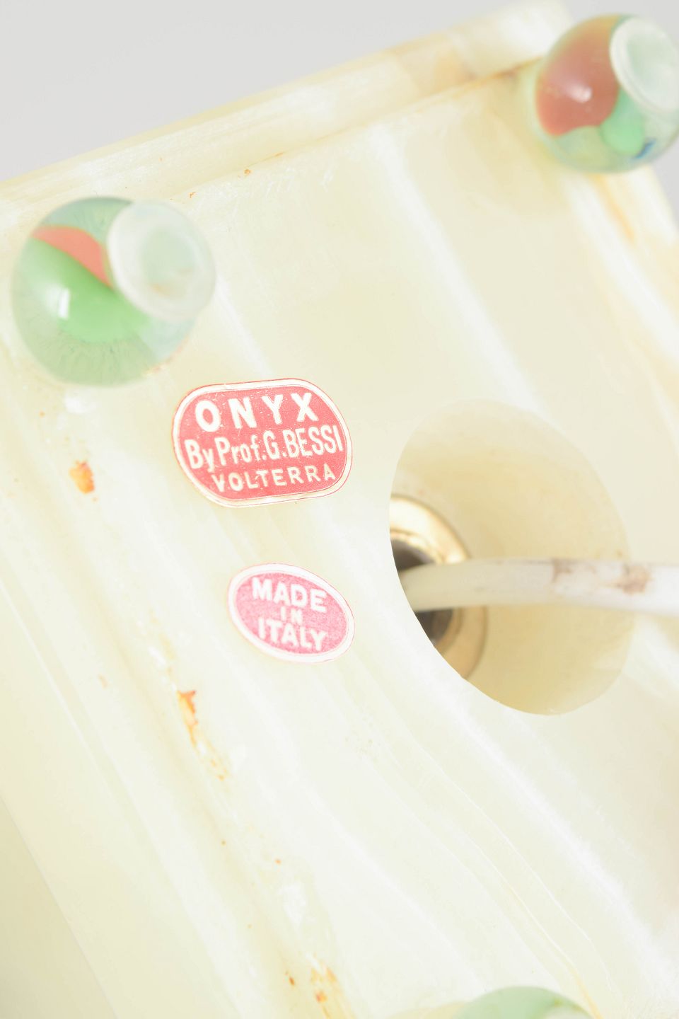 Elegant par bordlamper i poleret onyx med naturlige årer i grønne, rosa og cremefarvede toner. Fod og top i messingdetaljer, monteret på små kugleben i glas. Klassisk italiensk design med tydelig reference til Volterras stenhuggertradition.