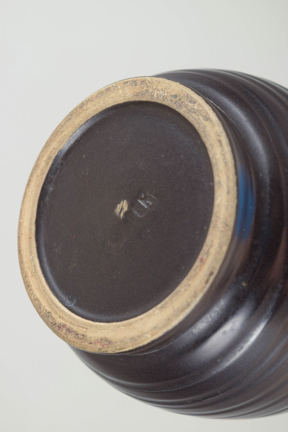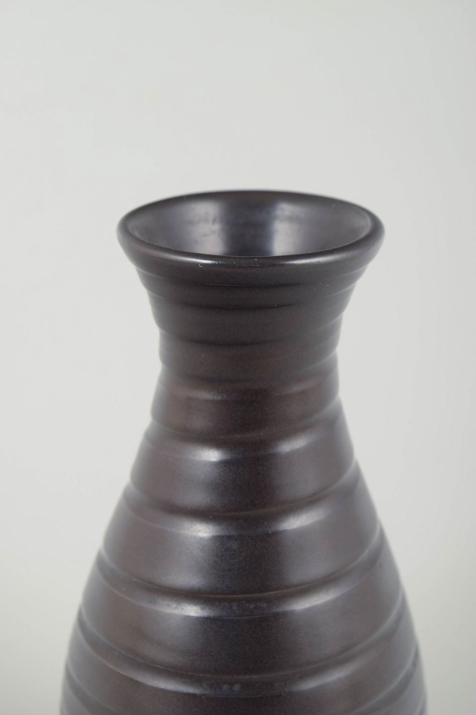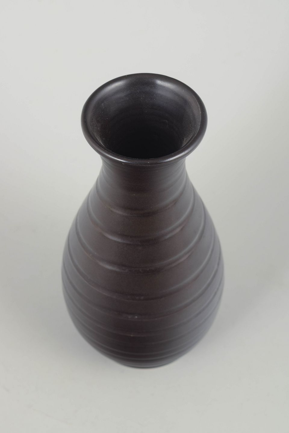 Hånddrejet keramisk vase i brunlig, mørk glasur med tydelige drejeriller, der giver formen et rytmisk og taktilt udtryk. Den klassiske dråbeform og den enkle proportionering er typisk for Bo Fajans’ håndlavede keramik fra perioden.