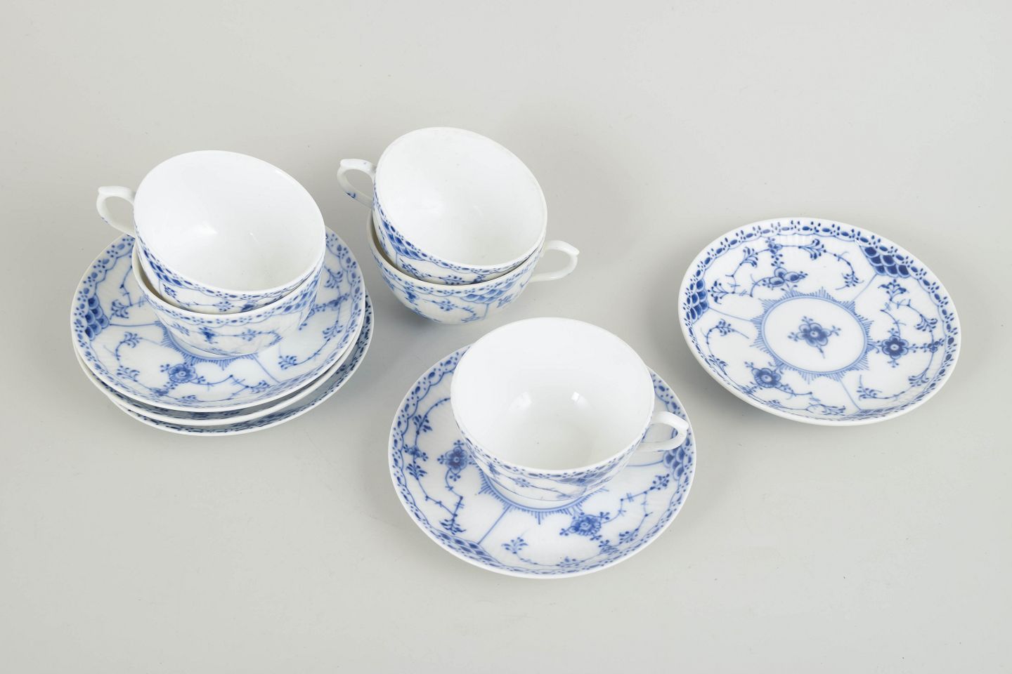 Klassiske musselmalet halvblonde kopper i håndmalet porcelæn. Det elegante musselmalede mønster og de fint modellerede kopper gør stellet til et af Royal Copenhagens mest tidløse designs.