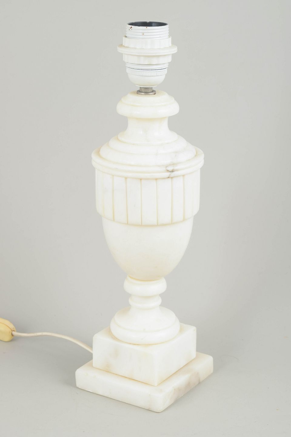 Klassisk formet bordlampe i hvid marmor med tydeligt profileret topstykke og vertikale riller på midterpartiet. Den enkle balusterform og den kvadratiske fod giver lampen et harmonisk og tidløst udtryk.
