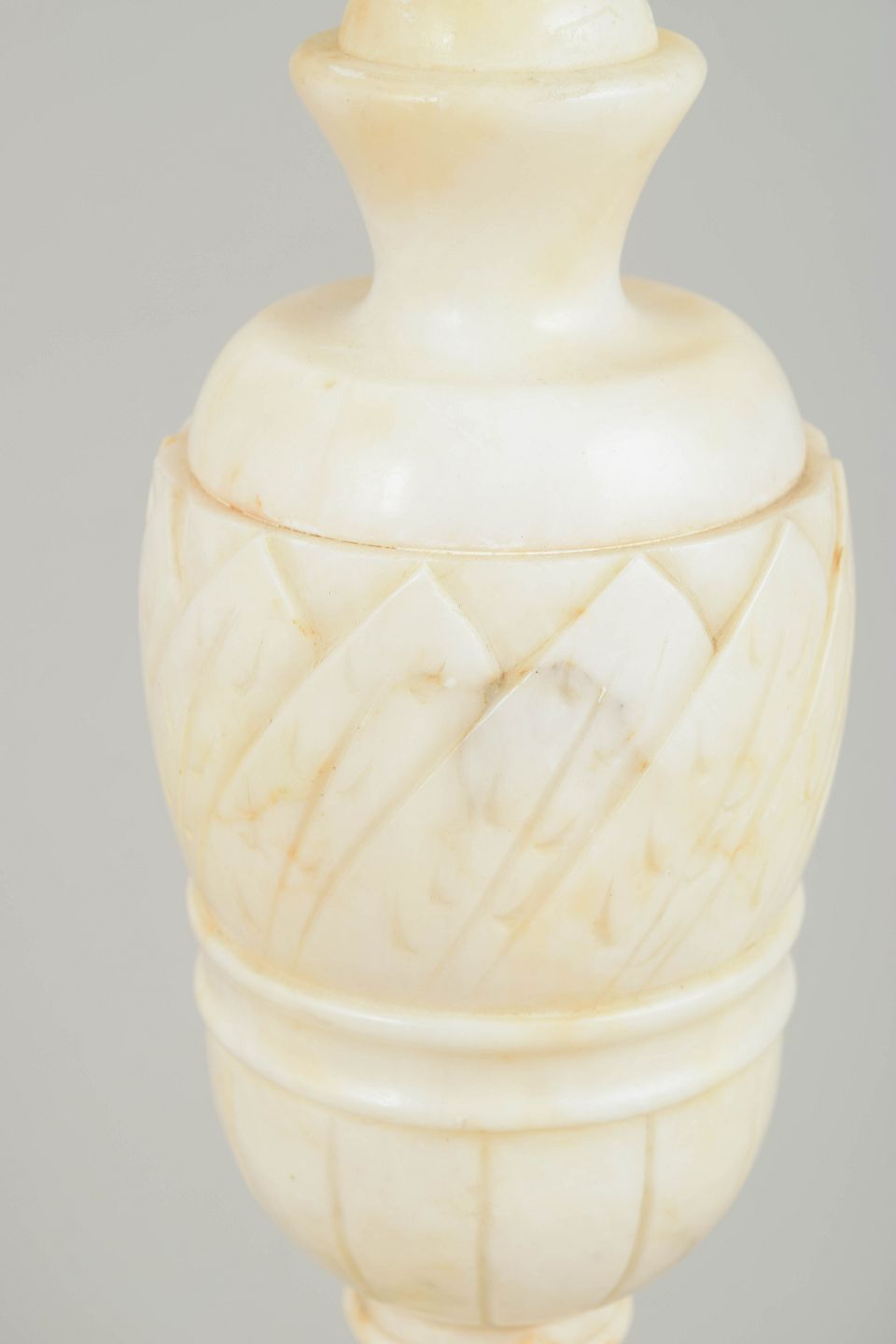 Decorative table lamp in light marble featuring carved diamond and vertical facet patterns that lend a classic, elegant form. The square base and soft proportions enhance the lamp’s sculptural presence.