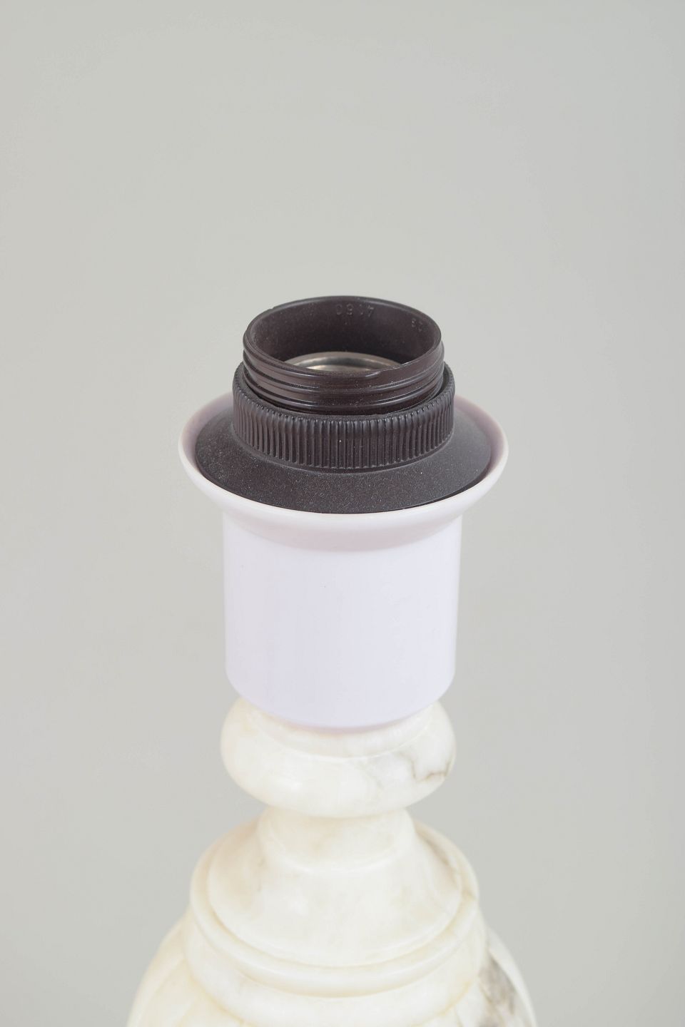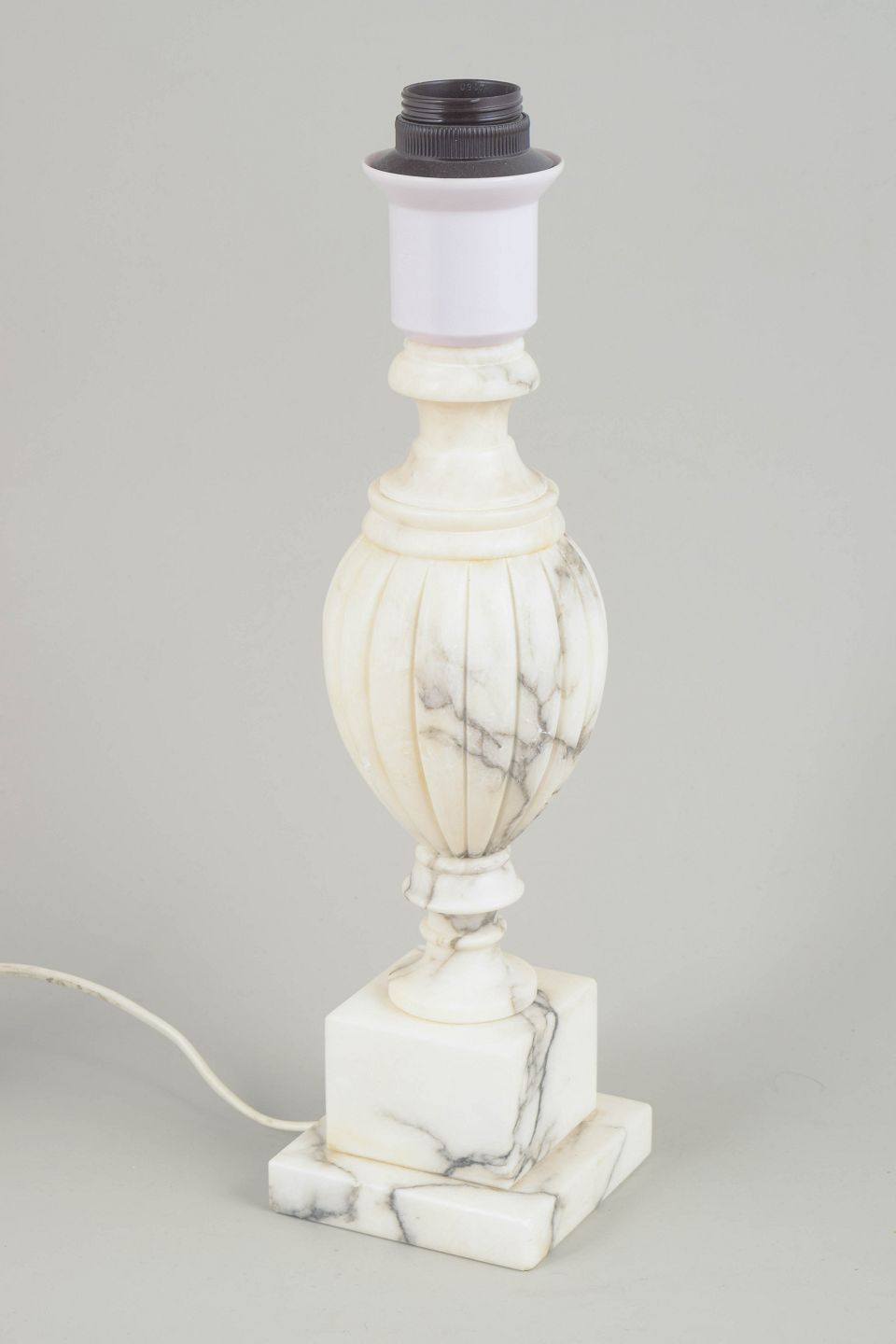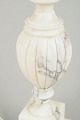 Elegant bordlampe udført i hvid marmor med markant årestruktur og klassisk balusterformet midterstykke. Den profilerede fod og de bløde, vertikale facetter giver lampen et raffineret og dekorativt udtryk.