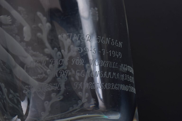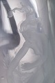 Rare Art Deco/early modern vase with deep sandblasted and engraved decoration depicting a floating female figure surrounded by waves and aquatic foliage. A technically accomplished and visually striking example of mid-century Scandinavian glass artistry.