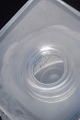 Frostet krystalglas vase på fod med firkantet base, rigt dekoreret med relief af blade og frugter i klassisk Lalique-stil. Den matte overflade kombineret med klare detaljer giver et elegant, skulpturelt udtryk.