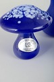 Dekorativ gruppe af svampe i kunstglas i varierende former og farver, herunder dybblå, lyseblå og flerfarvet glas. Organiske silhuetter med markant fokus på farvespil og overfladeeffekter. Mærkat forekommer på nogle eksemplarer.