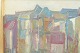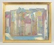 Modernistisk bymotiv udført i olie med forenklede arkitektoniske former og afdæmpet farveskala, signeret nederst til højre.