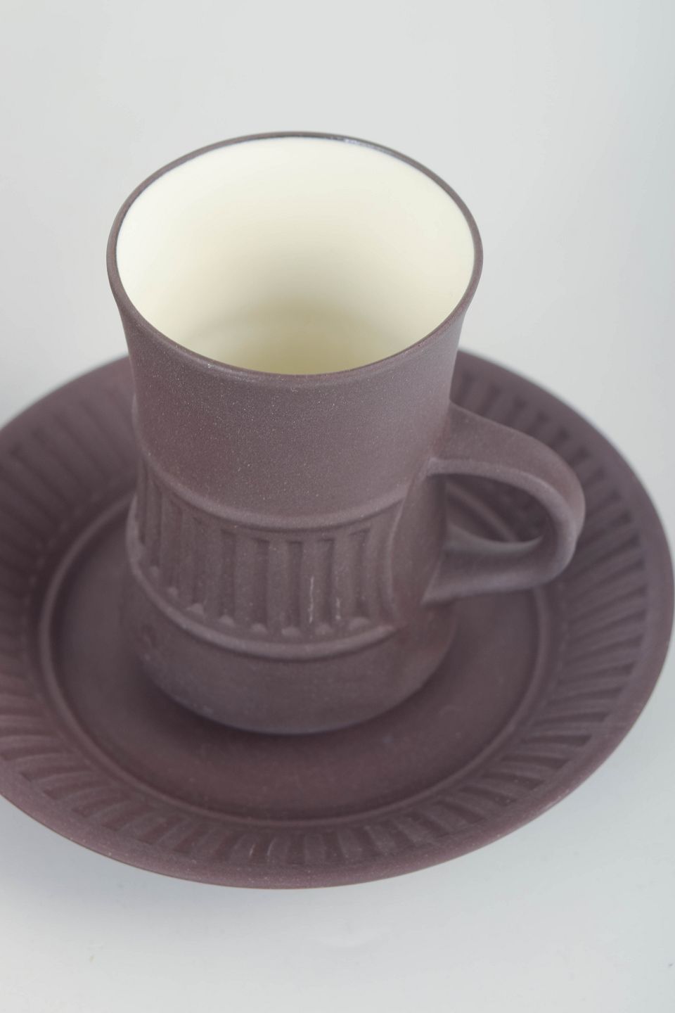 Set consisting of four stoneware coffee cups with matching saucers, executed in a white glaze with ribbed decoration and white glaze to the interior.