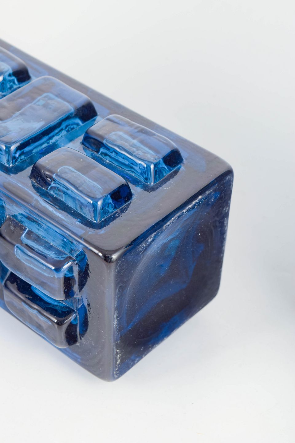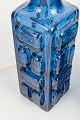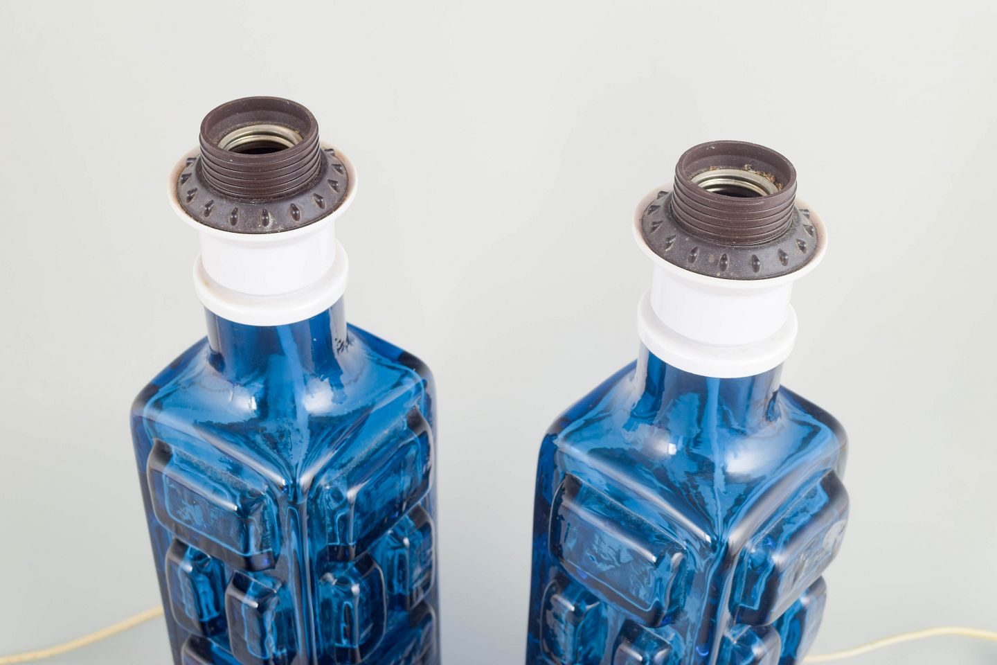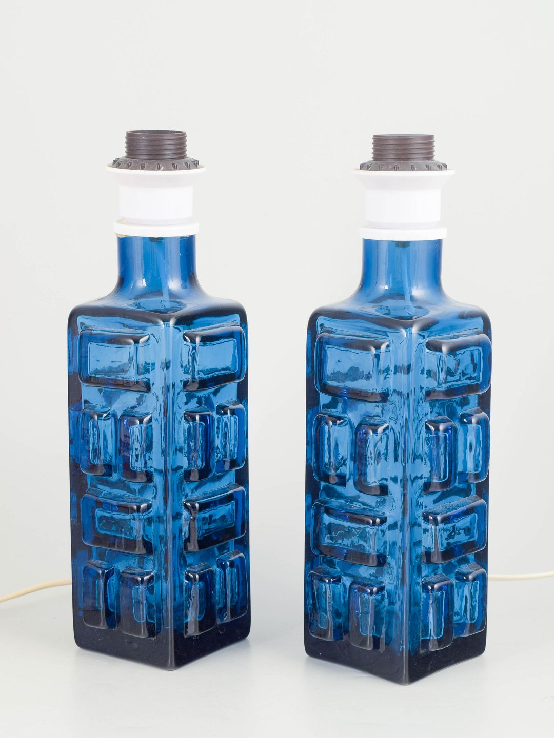Pair of table lamps in blue pressed glass with geometric relief decoration. Produced by Pukeberg in Sweden in the 1970s.