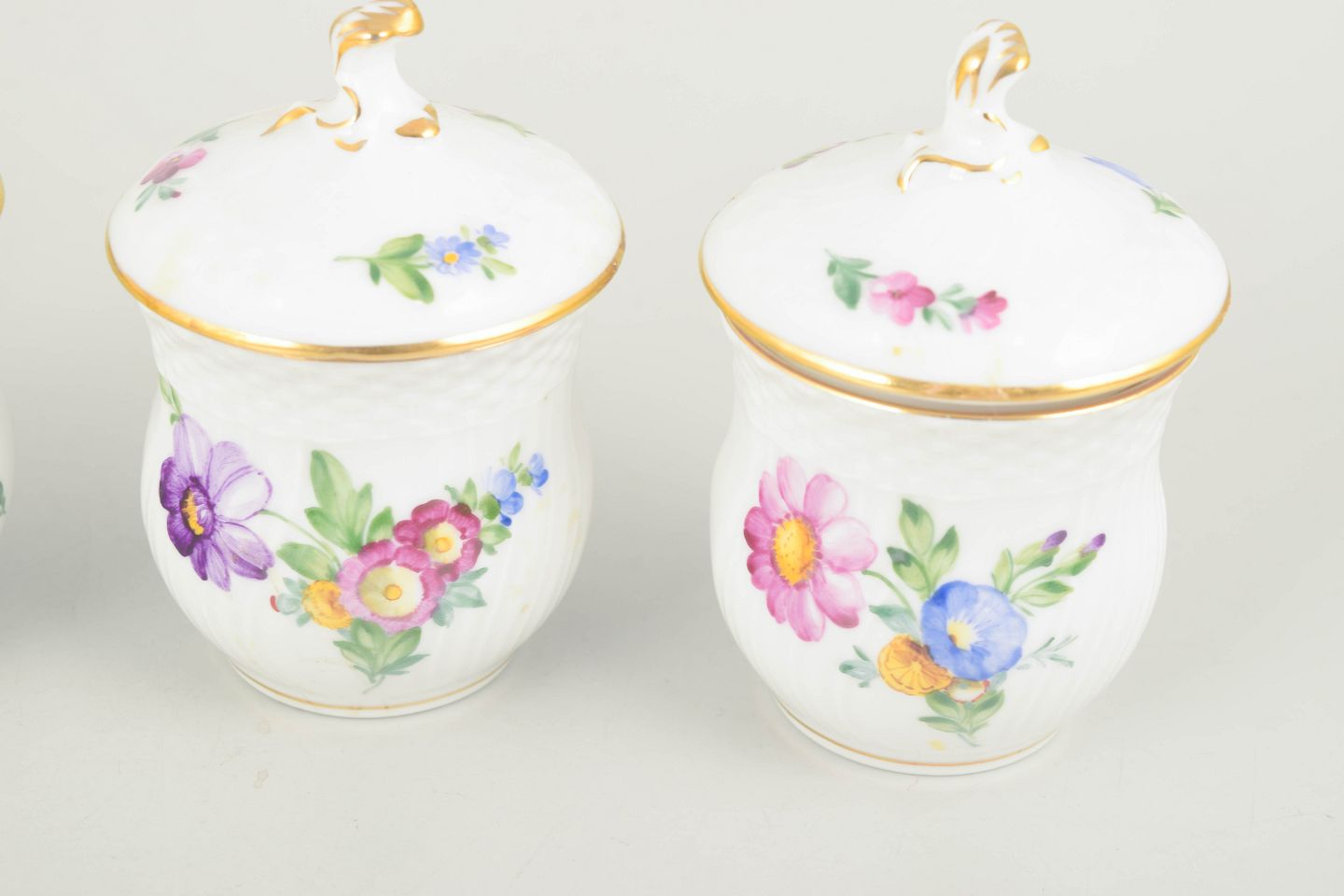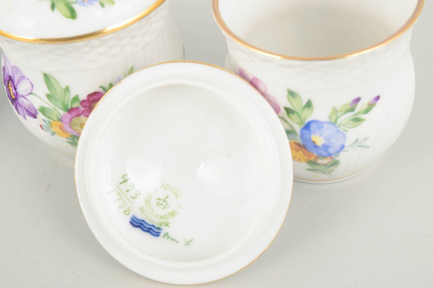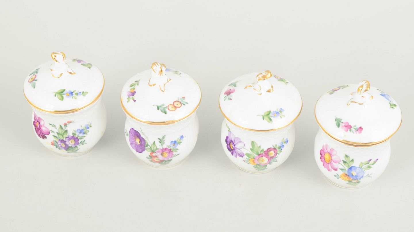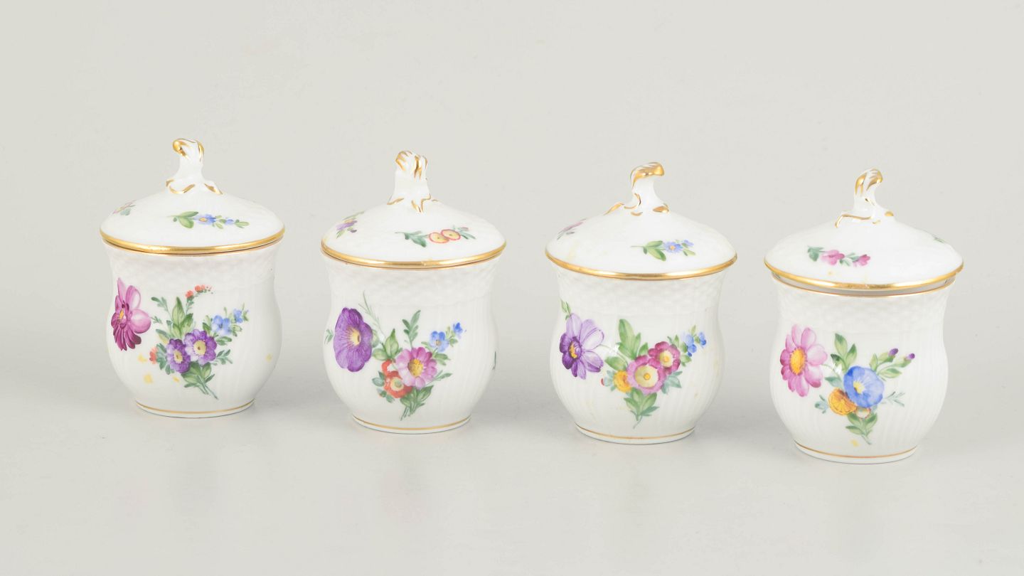 Royal Copenhagen, saksisk blomst sæt af fire cremekopper med tilhørende låg.