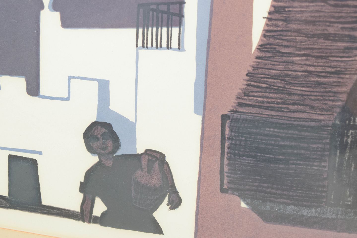 Grafisk komposition med stiliseret bymotiv og figurative elementer udført som farvelitografi, signeret i blyant og nummereret 116/310.