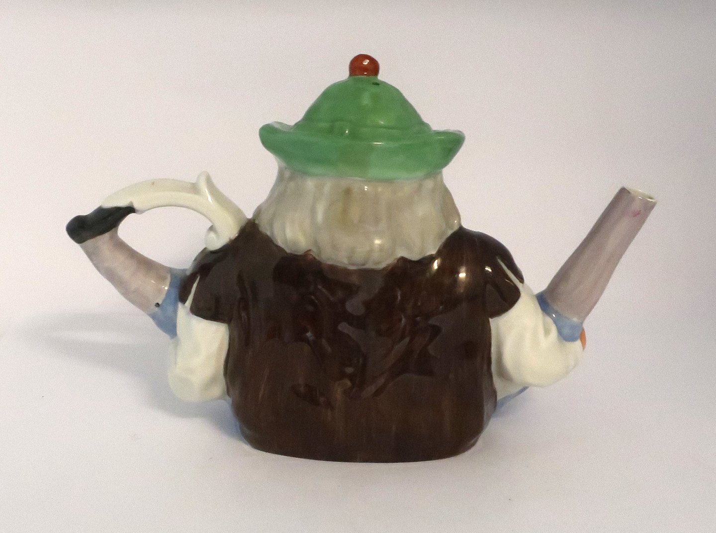 Royal Copenhagen. Teapot in the shape of a man. Hat is the lid, and legs are the spout and handle. Length 24 cm. Height 16 cm. Produced before 1900. Supposed to have been made by Princess Marie, married to Prince Valdemar.