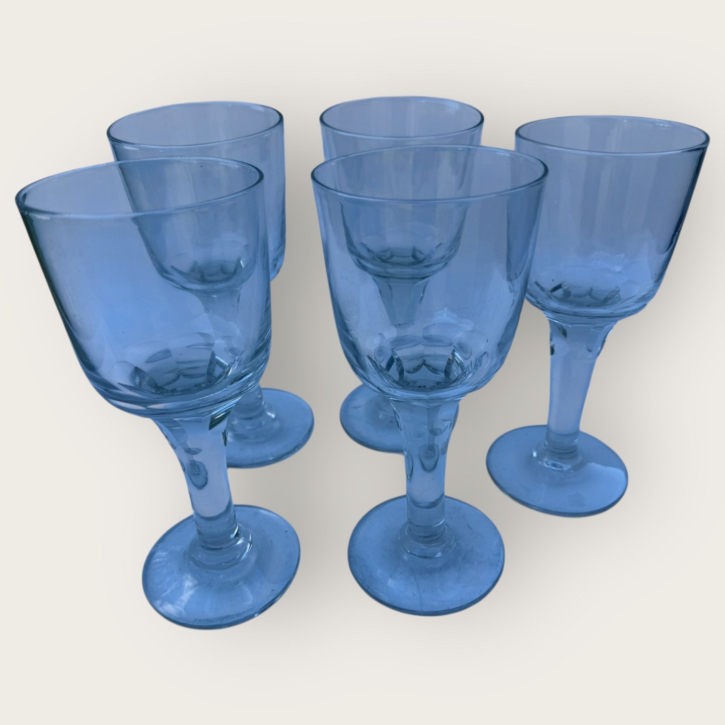 Tall older glasses with a cut stem, wide bowl and thick glass, height 21.3cm, diameter 9cm