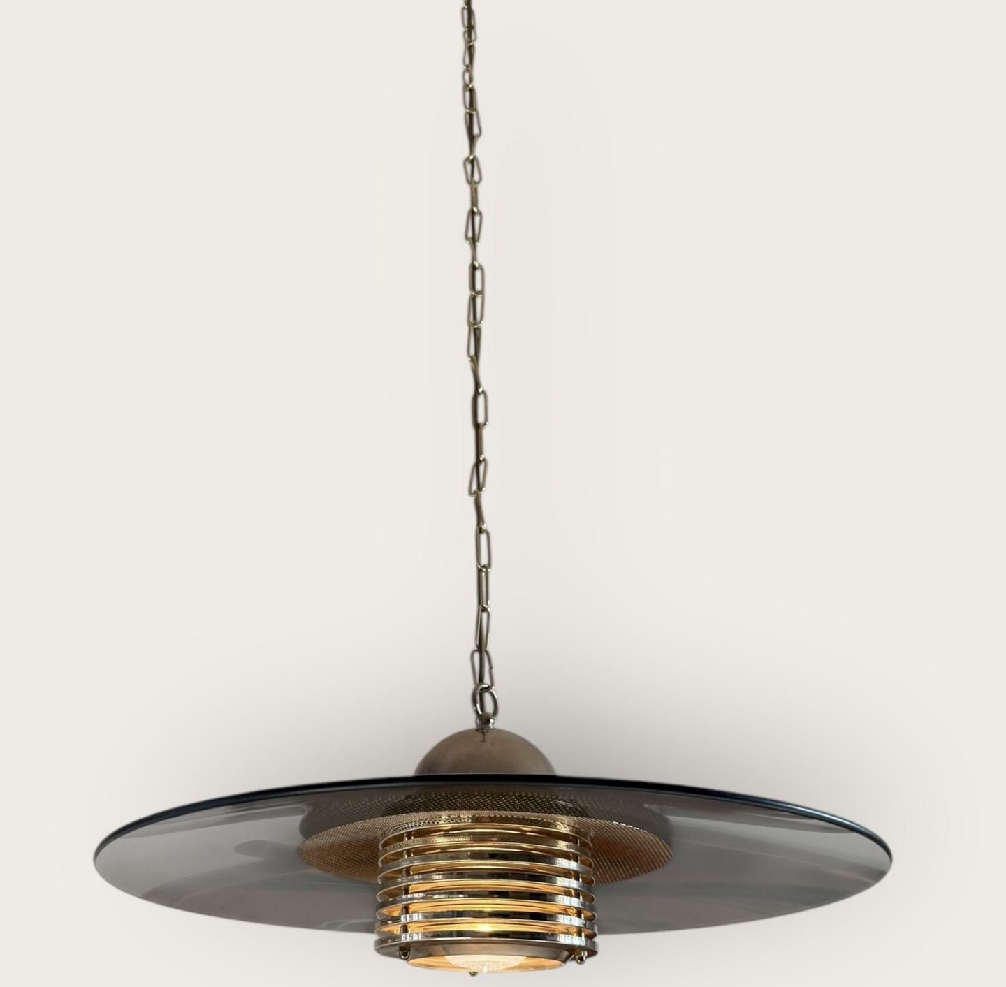 Jan-Eskild Eskildsson, Belid, Schweden, Reflektor-Deckenleuchte aus Rauchglas und Messing, Durchmesser 49 cm *guter Zustand*