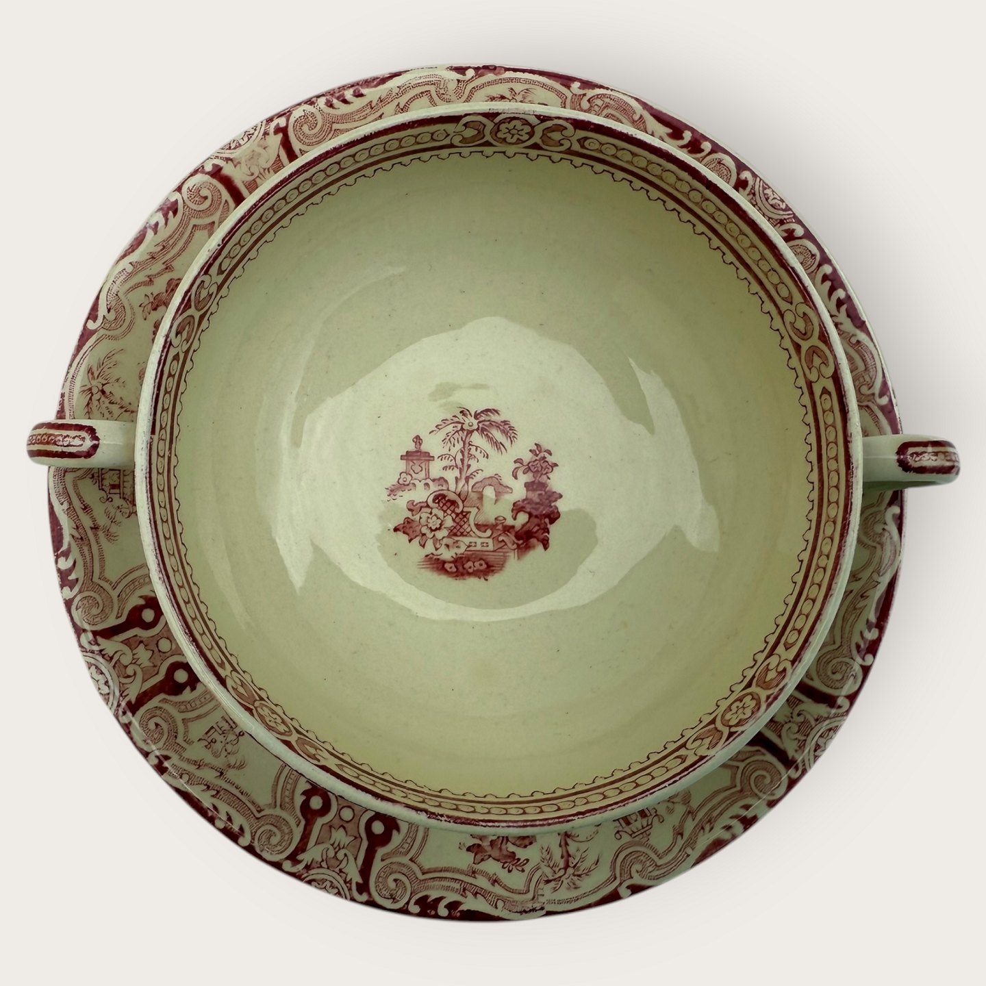 William Adams, Kyber med rødt kinesisk motiv, Bouillonkop, Kop diameter 12cm, underkop17cm, pæn brugt stand.