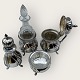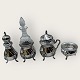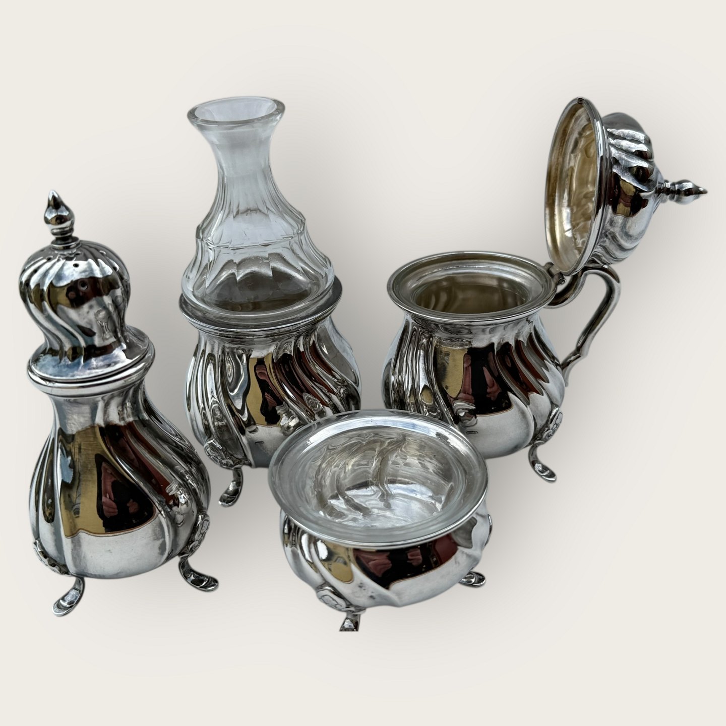 Cohr silverware factory, Plat de Menage, 4 parts, salt shaker with glass insert, mustard jar also with fine glass insert and bottle / carafe in fine condition (height 15.5cm), Salt shaker diameter 6cm, mustard jar 11cm high, Pepper shaker 12cm high