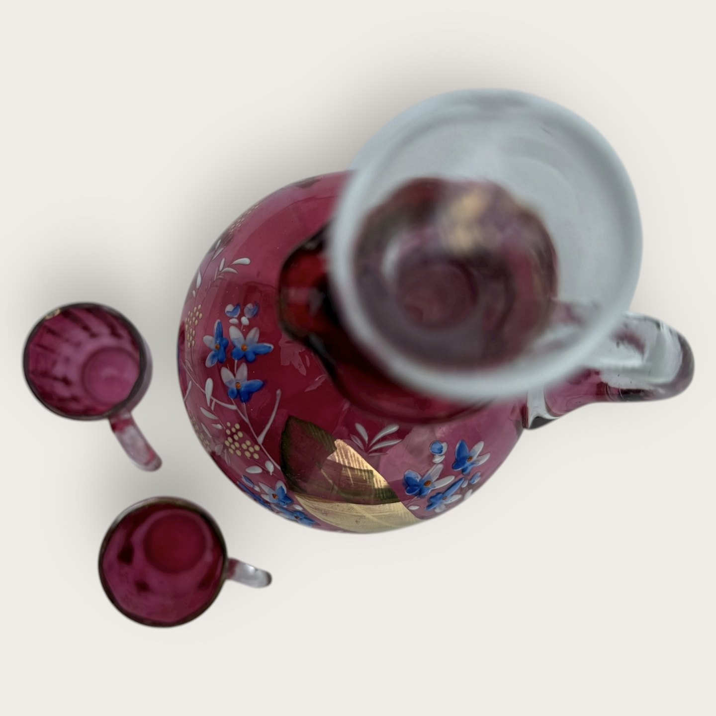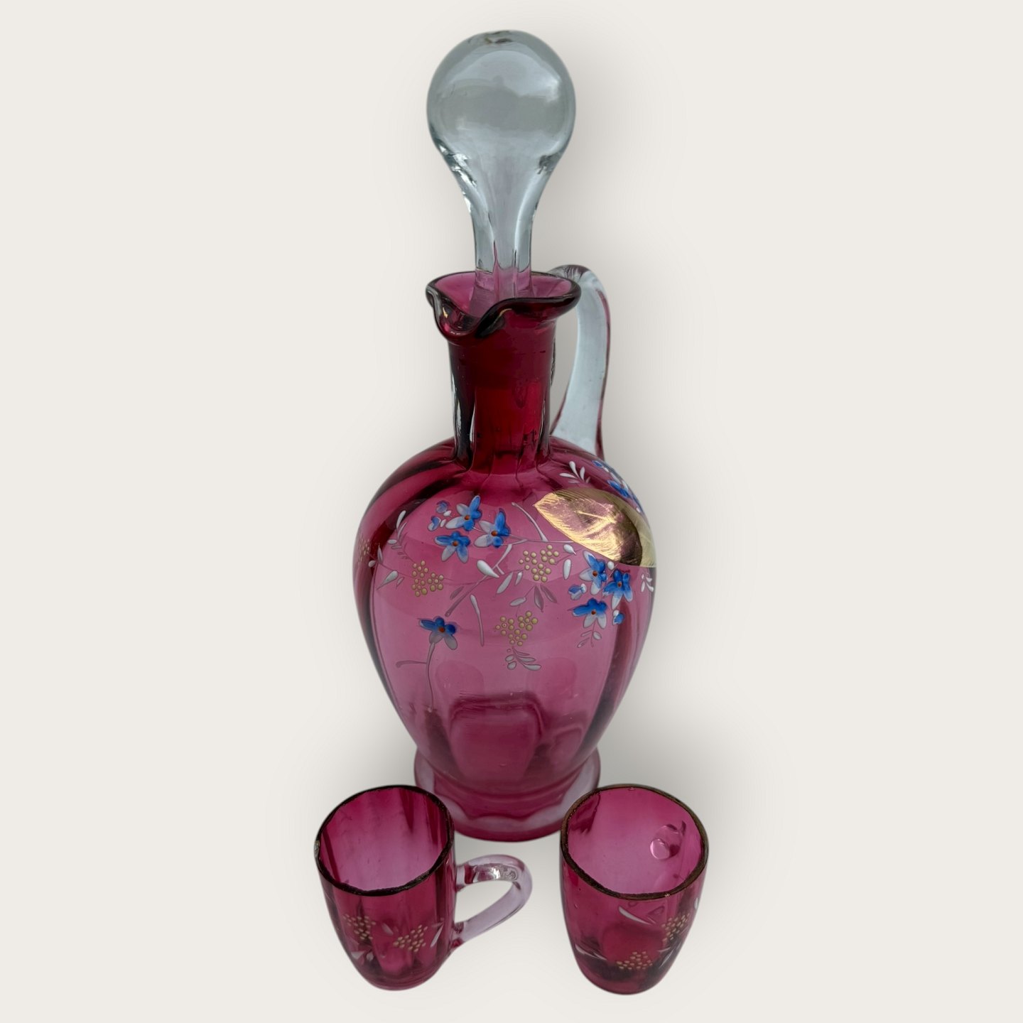 Ældre midteuropæisk karaffel i pinkfarvet glas med bemaling, medfølgende 2 glas, Karaffel ca. 21cm høj og 9cm bred, de to glas har meget små nøk i kanten, karaflen er i fin stand.