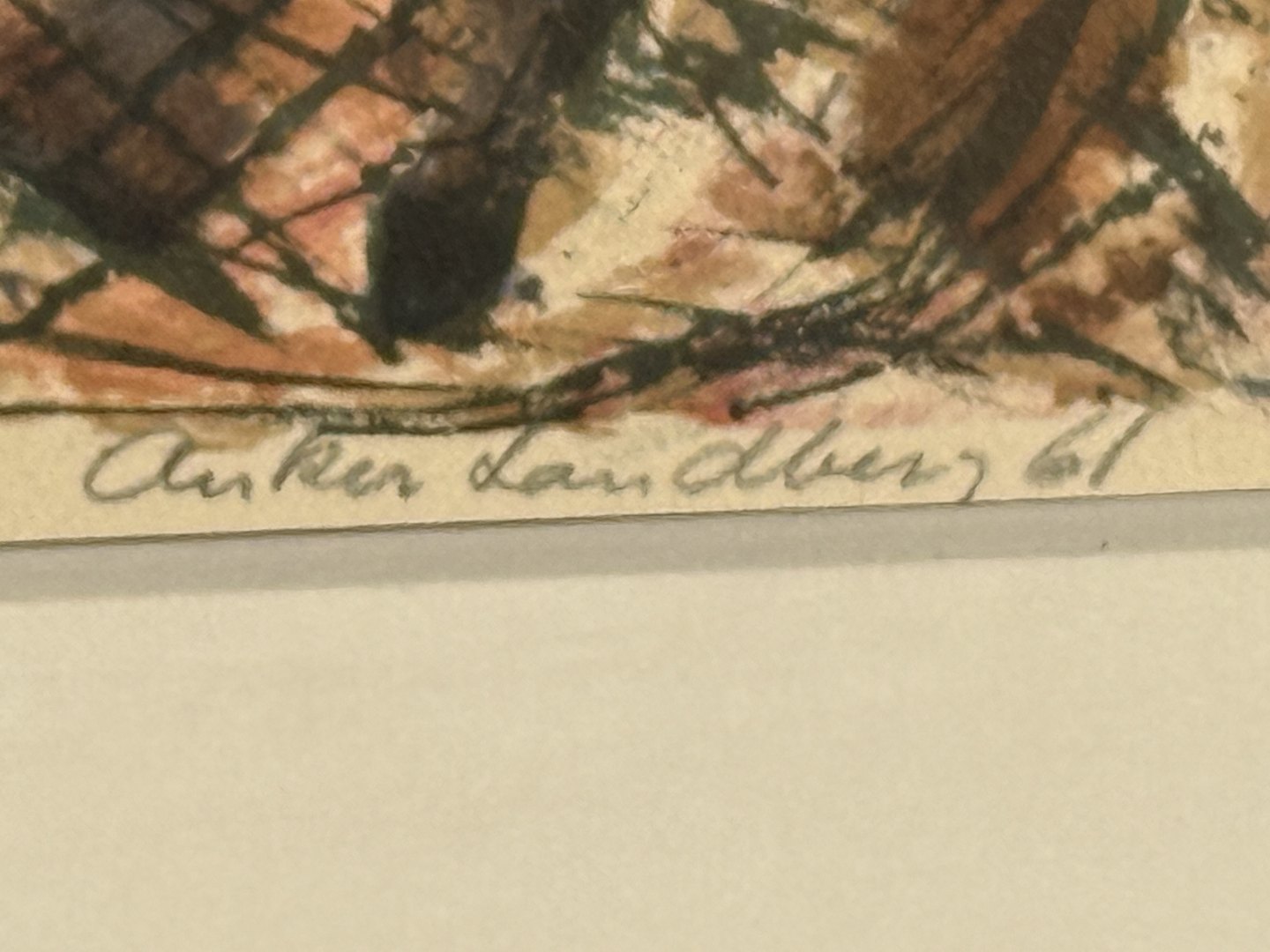 Anker Landberg, Litografi i ramme, Fiskere ordner garn, signeret Anker Landberg 61 og 31/100, Mål med ramme: 66x48cm *fin stand*